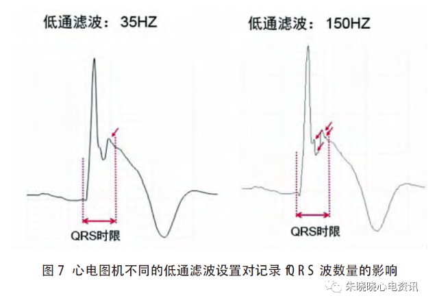 心电图机的低通滤波常用以减少心电图记录时的交流电干扰和肌肉噪声,对记录心电图而言,心电信号记录频率越高心电图失真越少。因此,低通滤波设置得是否合理可直接影响到fQRS波的采集(图7)。