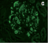 图C 肾小球系膜区、血管袢A蛋白阳性(IF,×200)