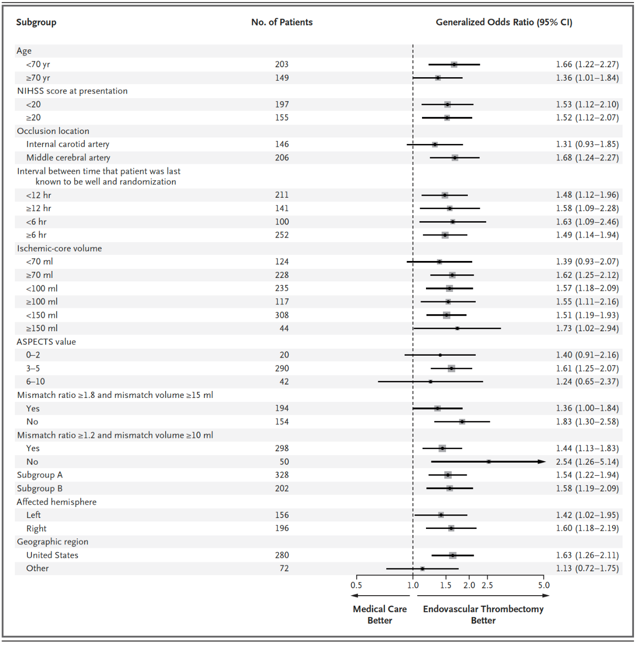 最终作者认为,对于大面积缺血性卒中患者,血管内血栓切除术比内科治疗组的功能结局更好,但会增加血管并发症。两组脑出血少见。