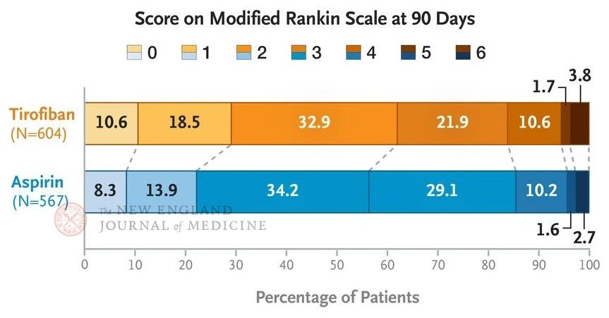 这项研究采用前瞻性、多中心、双盲、双模拟随机对照设计,受试者按照1:1的比例随机分配到替罗非班组和阿司匹林组。本研究最终入组1177例患者,其中606例为替罗非班组,571例为阿司匹林组。试验结果显示,替罗非班组有显著的临床疗效,尽管轻微增加脑出血的发生,但使用替洛非班的安全性方面与现有治疗方式比较仍无明显差异。
