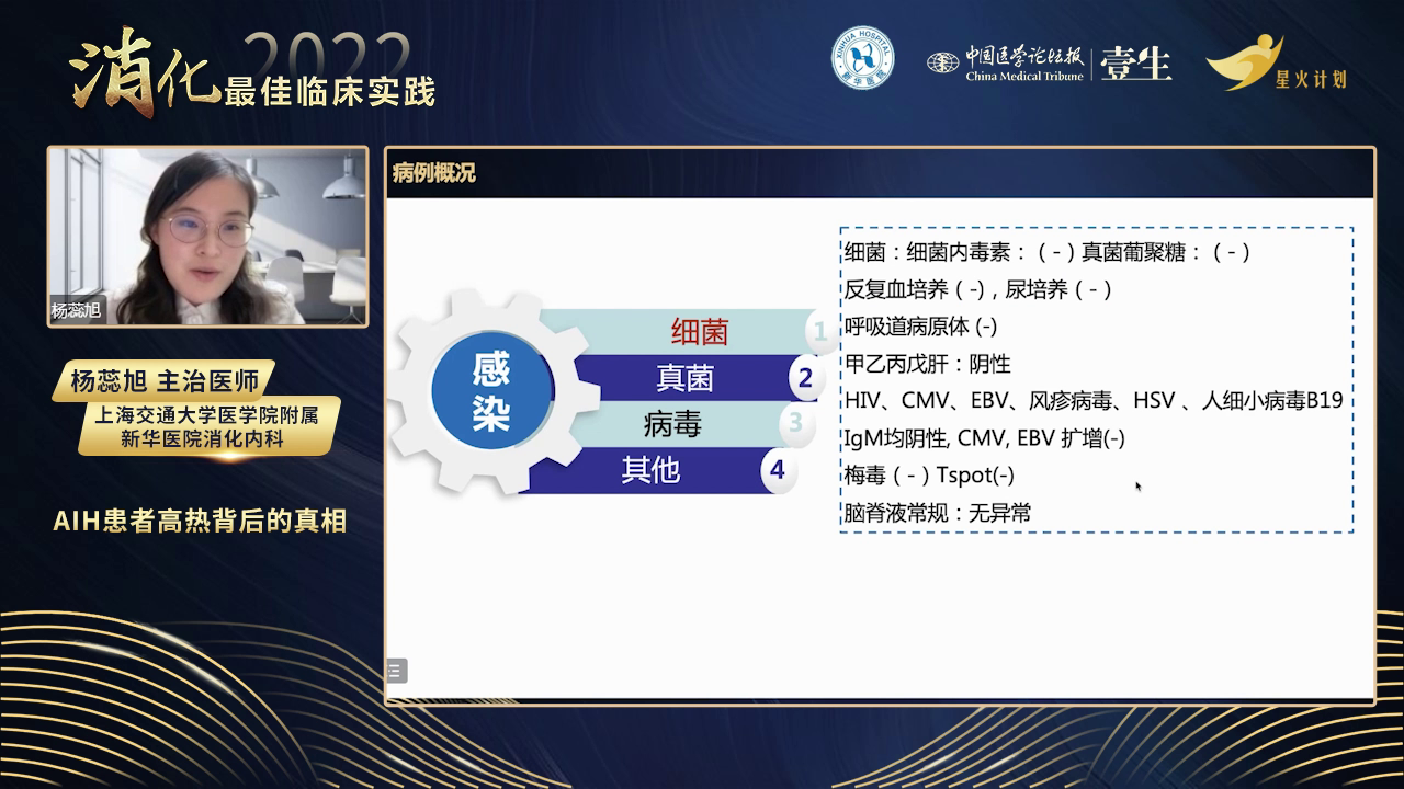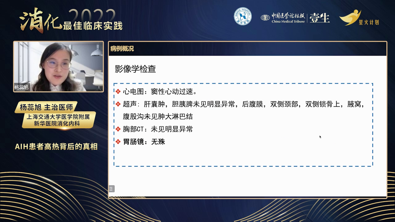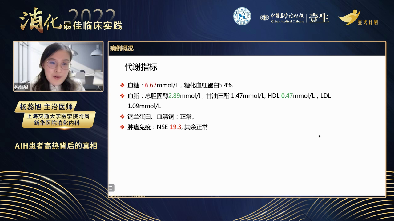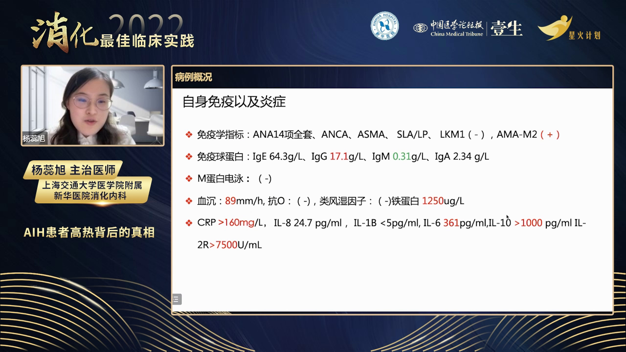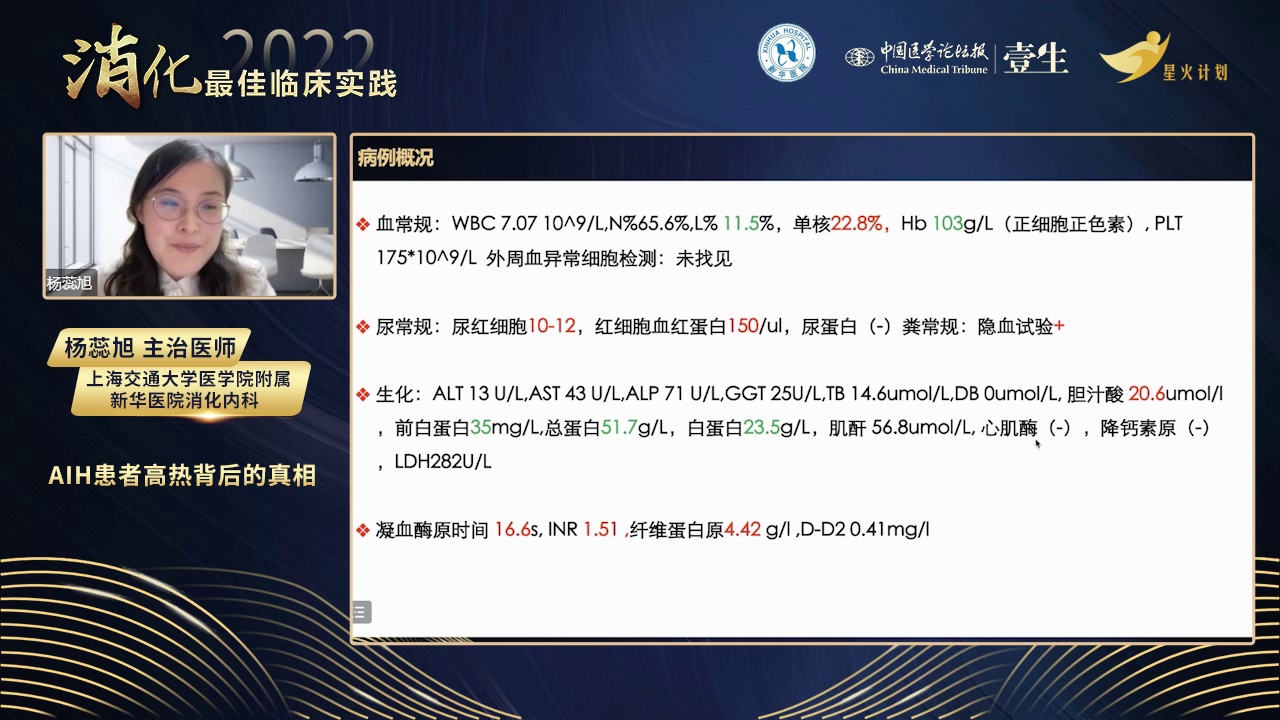病情分析:患者有AIH病史,但此次入院转氨酶和ALP正常,无AIH活动依据。虽有发烧、血细胞减少,但外周血涂片无异常细胞,全身淋巴结无肿大,血液系统肿瘤依据不足。给予左氧氟沙星抗感染无效,患者持续高热近20天,CRP居高不下,血红蛋白和血小板进行性下降,白细胞介素-2受体及铁蛋白明显升高,考虑出现噬血细胞综合征。