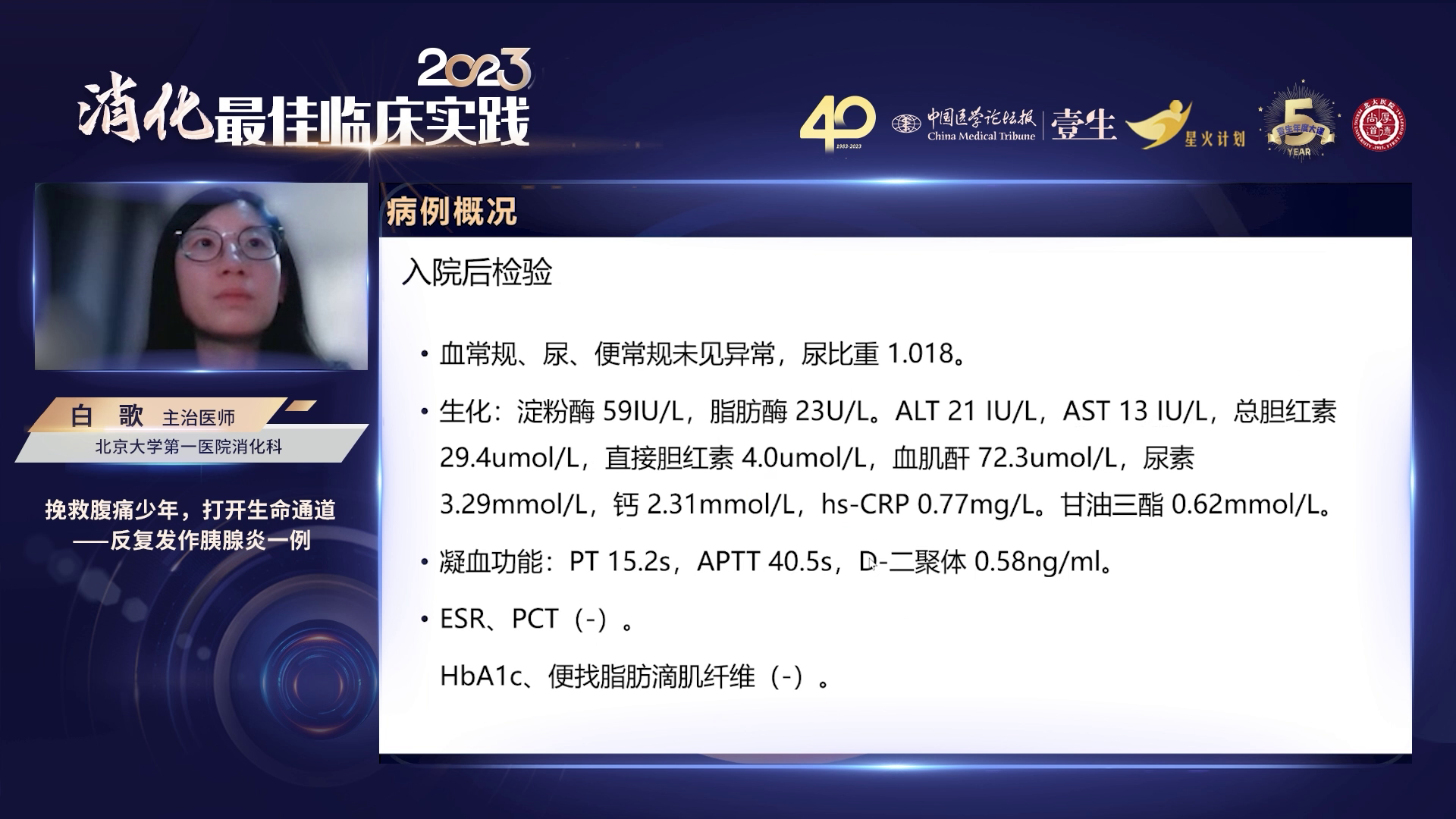 无特殊,否认特殊用药史及保健品应用史,无烟酒嗜好,未婚,无胰腺炎及肿瘤家族史。