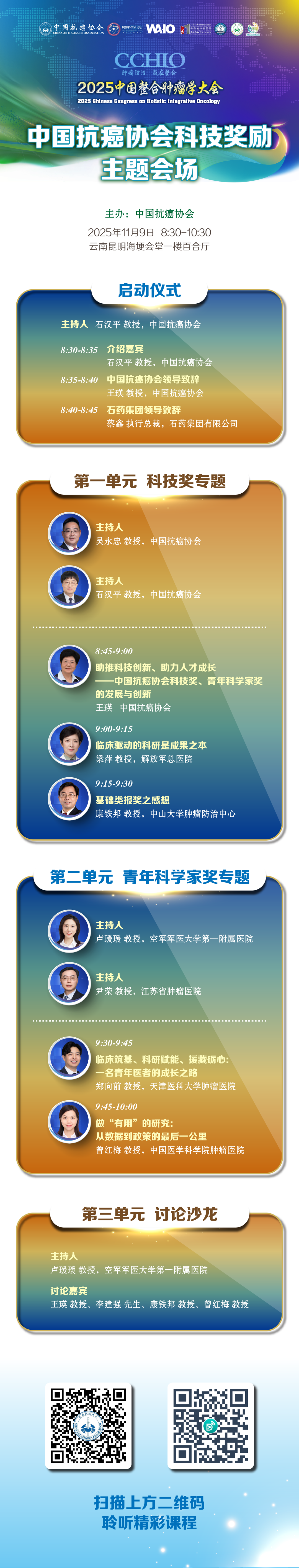 为了更好地展示获奖项目,搭建与获奖人交流的平台,中国抗癌协会将举办科技奖励主题会场。会议将由协会领导深入介绍科技奖的发展历程与创新、评审要求和流程,获奖项目特点;科技奖获得者将介绍如何带领团队在本研究领域进行科研和技术创新,开展基础研究并积极向临床转化应用,以及介绍如何进行奖励申报,更好地展示研究成果;青年科学家奖获得者将分享他们如何走向肿瘤医学研究的道路,如何选择研究方向并开展深入研究的经历和体会。帮助更多肿瘤医学科技工作者提升、拓宽科研思路,为大家呈现一场别具一格的学术盛宴。