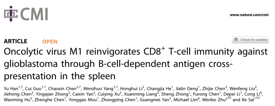 近日,中山大学肿瘤防治中心神经外科赛克教授团队联合中山医学院颜光美、朱文博教授团队,在国际权威免疫学期刊Cellular & Molecular Immunology发表题为溶瘤病毒 M1 通过脾脏中 B 细胞依赖性抗原交叉呈递重新激发针对胶质母细胞瘤的 CD8+T 细胞免疫反应的封面文章。
