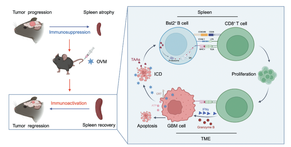 本研究首次揭示了溶瘤病毒M1(OVM)的脾脏依赖作用,明确其可通过B细胞抗原交叉呈递激活CD8⁺T细胞抗肿瘤免疫,进而逆转胶质母细胞瘤诱导的局部及系统性免疫抑制。同时证实,溶瘤病毒M1与抗PD-1疗法联用可显著提升胶质母细胞瘤的治疗效果。该发现不仅为胶质母细胞瘤的系统免疫治疗提供了全新策略,也为溶瘤病毒的临床转化应用奠定了重要的机制基础。