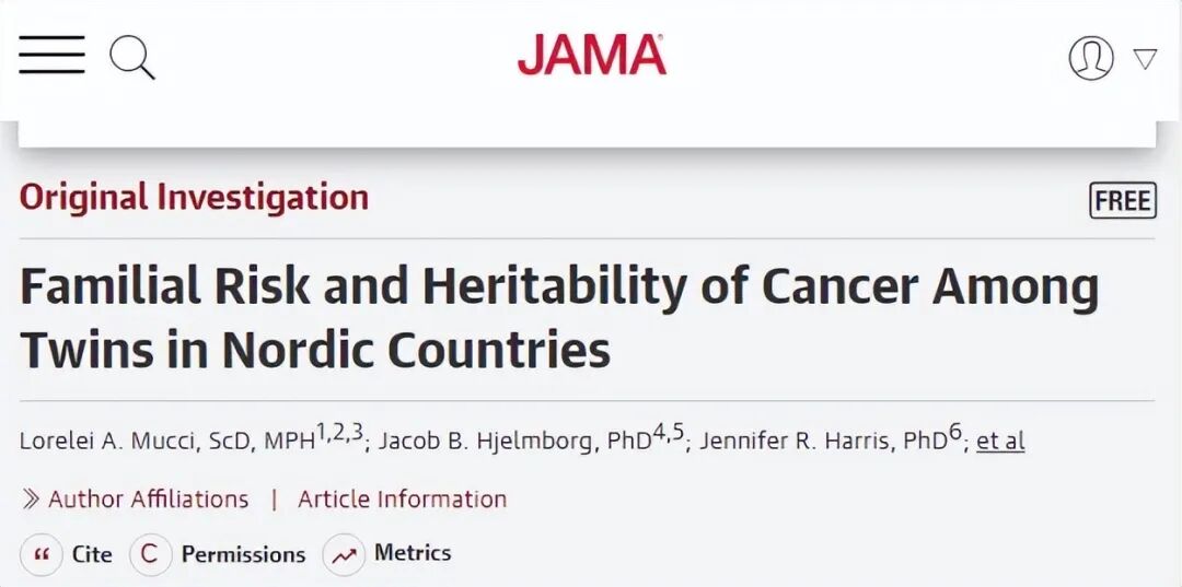 2016年《JAMA》又刊登了一篇来自哈佛大学科学家与丹麦和芬兰研究员的研究报告,指出至少有22种癌症具有高度遗传风险,如果家族中有父母或兄弟姐妹曾经患癌,那么其他成员患同样癌症的概率也会上升33%。