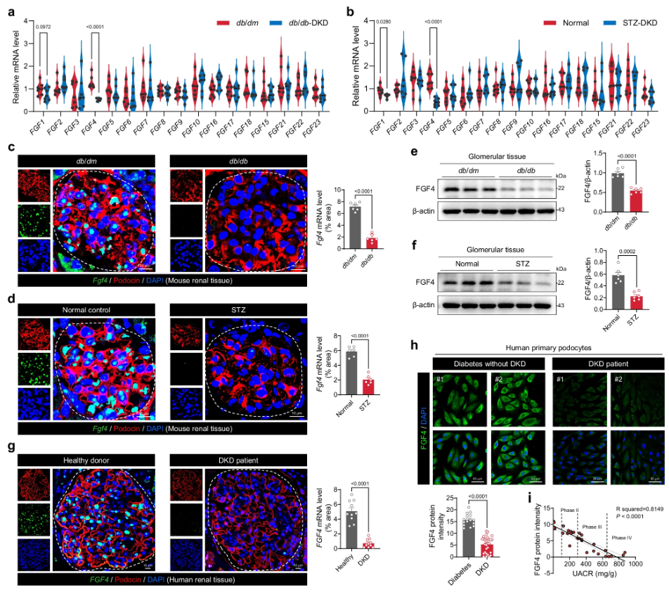 通过对临床样本与动物模型的系统分析,研究发现由足细胞特异性分泌的FGF4在疾病状态下表达显著降低,且其表达水平与DKD的严重程度呈明显负相关,提示FGF4可能在疾病发展中起到重要的内源性保护作用。
