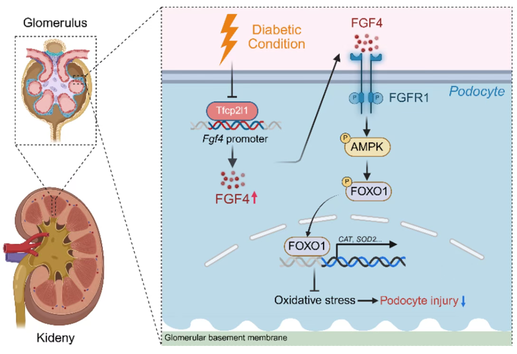 该研究首次明确了成纤维细胞生长因子4(FGF4)在维持肾小球足细胞稳态中的关键调控作用,系统揭示了FGF4-FGFR1-AMPK-FOXO1信号轴在保护足细胞功能方面的核心机制,为糖尿病肾病的防治提供了新的治疗靶点与理论支撑。