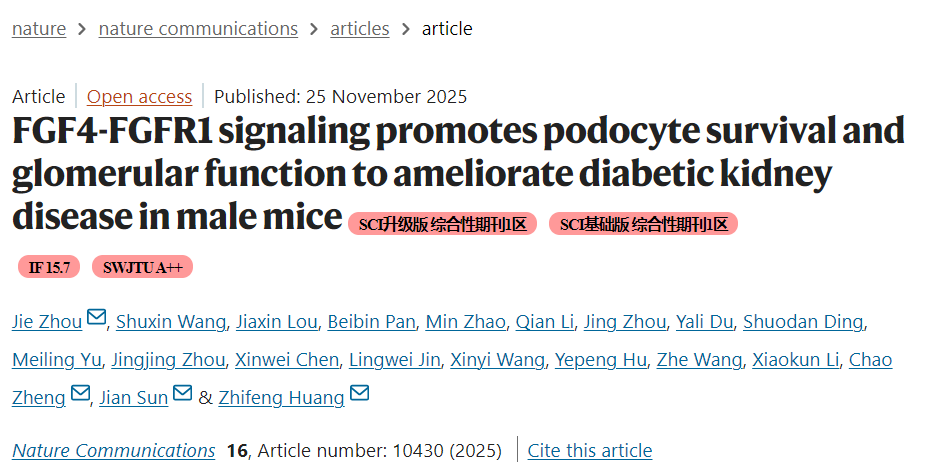 2025年11月25日,浙江大学医学院附属第二医院郑超主任团队与温州医科大学李校堃院士团队黄志锋、周洁、孙健课题组合作,在《自然·通讯》[Nature Communications(1区,影响因子15.7)]发表了题为“FGF4-FGFR1 signaling promotes podocyte survival and glomerular function to ameliorate diabetic kidney disease in male mice”的研究论文。