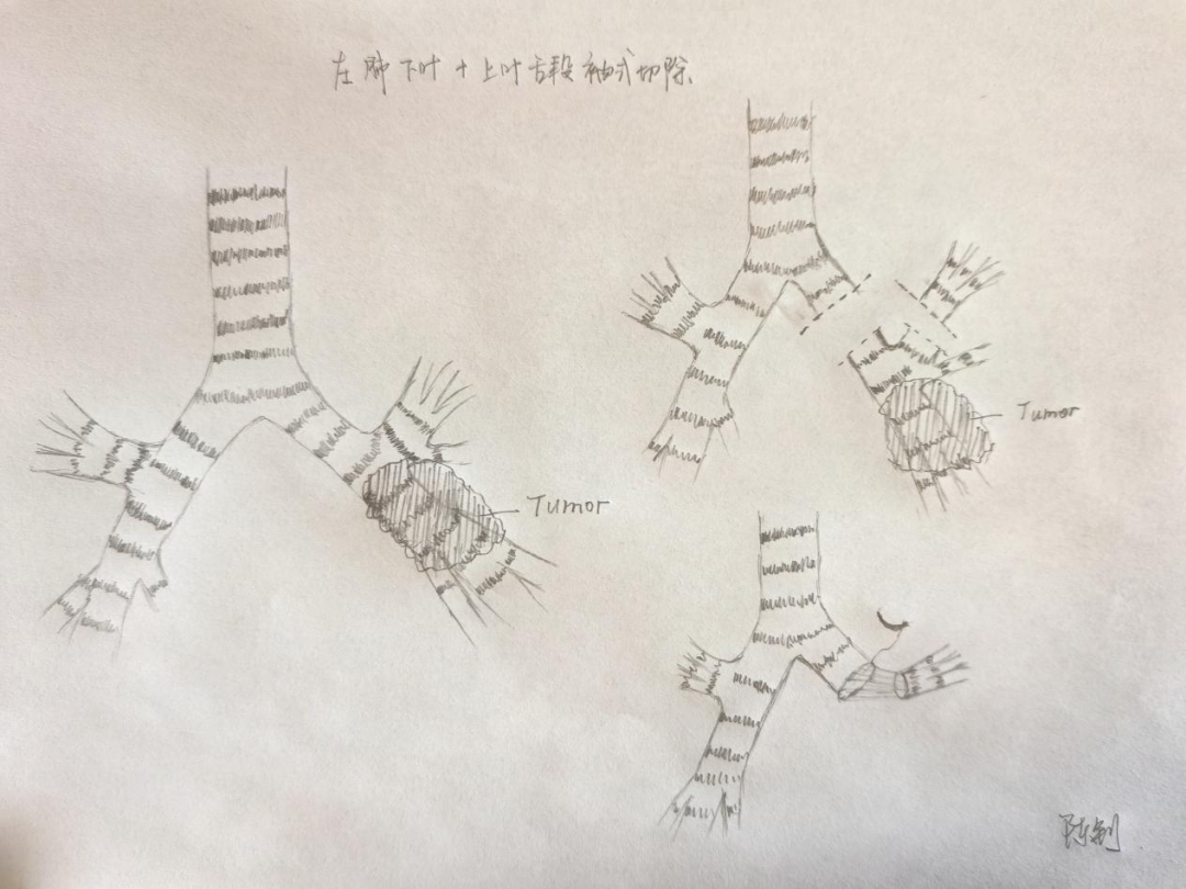 针对胡大爷的病情,医院迅速组织了多学科会诊,胡大爷处于潜在可切除的局部晚期中央型肺鳞癌,结合指南推荐,术前新辅助治疗有助于改善患者的生存和预后。团队制定了“先行辅助治疗,再行根治手术”的方案:先使用化疗联合免疫进行新辅助治疗2~3周期,第3周期结束后综合评估患者情况后决定是否可行手术治疗。在完全切除肿瘤的基础上,尽可能保留肺组织,手术方案选择单孔胸腔镜左肺下叶+上叶舌段袖式切除术+纵隔淋巴结清扫。