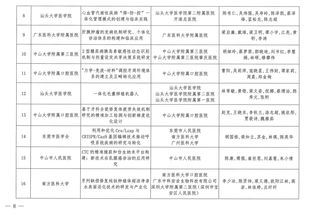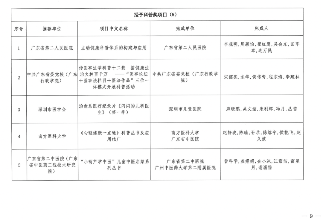 这些的群体、同仁还很多,本届5个——广东医学科技奖医学科普奖5个(其他项目36个:广东医学科技奖医学科学技术奖一等奖8名、广东医学科技奖医学科学技术奖二等奖12名、广东医学科技奖医学科学技术奖三等奖16名)——项目获奖代表就是佼佼者。作为五个科普奖获奖者们,更当彼此欣赏、取长补短、互相借鉴、共同助力,让广东更健康、更平安、更法治、更有品位,是我们不变的信念。