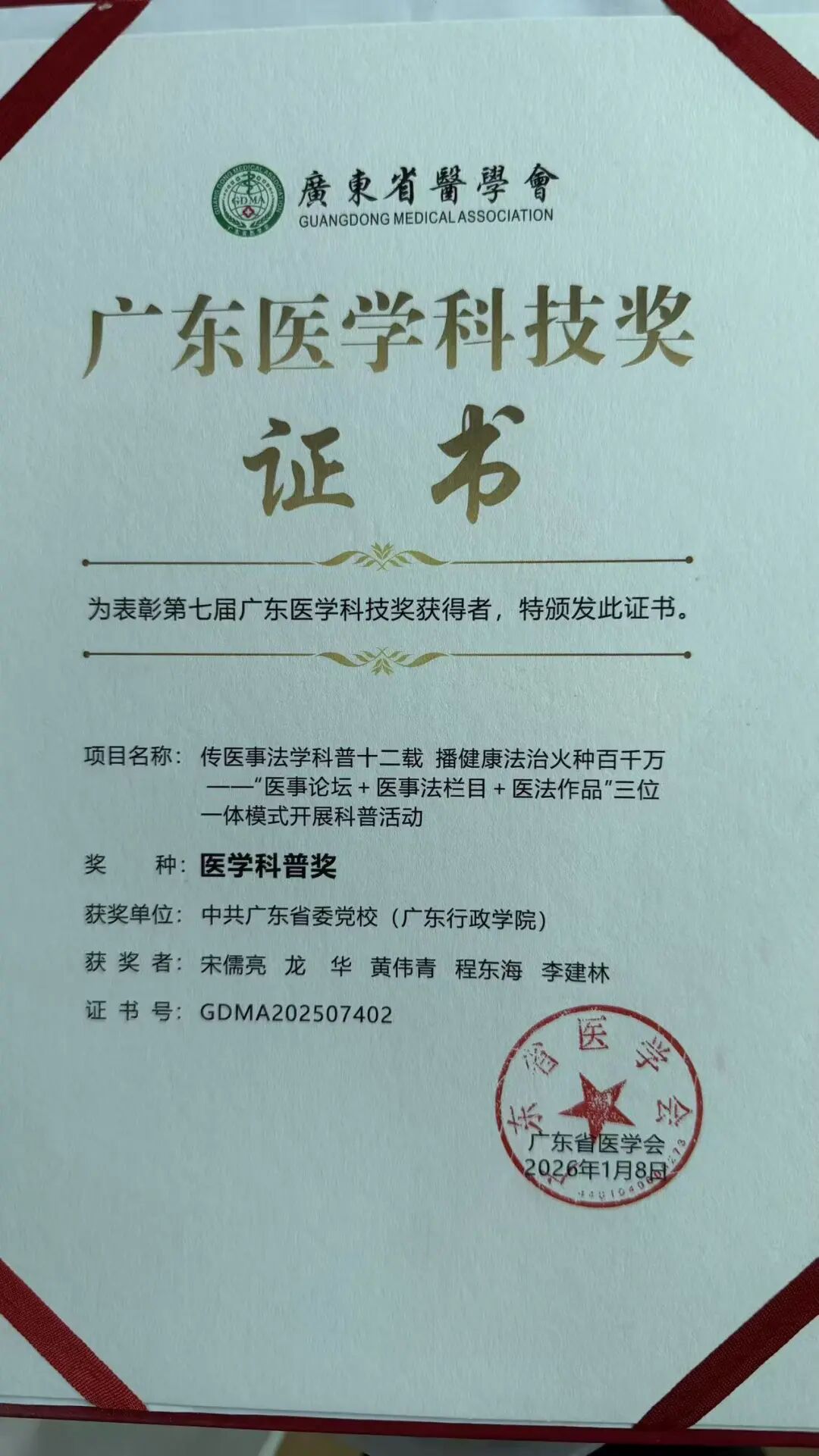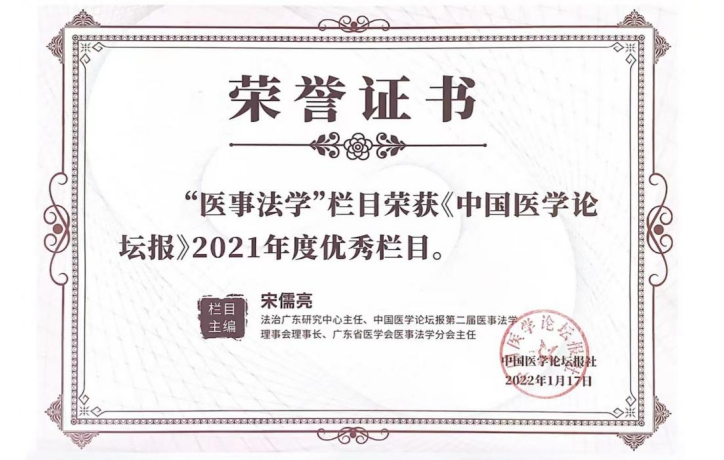 宋儒亮主任牵头,龙华、黄伟青、程东海、李建林等共同申报的科普项目“传医事法学科普十二载 播健康法治火种百千万——‘医事论坛+医事法栏目+医法作品’三位一体模式开展科普活动”荣获广东医学科技奖(医学科普奖)。