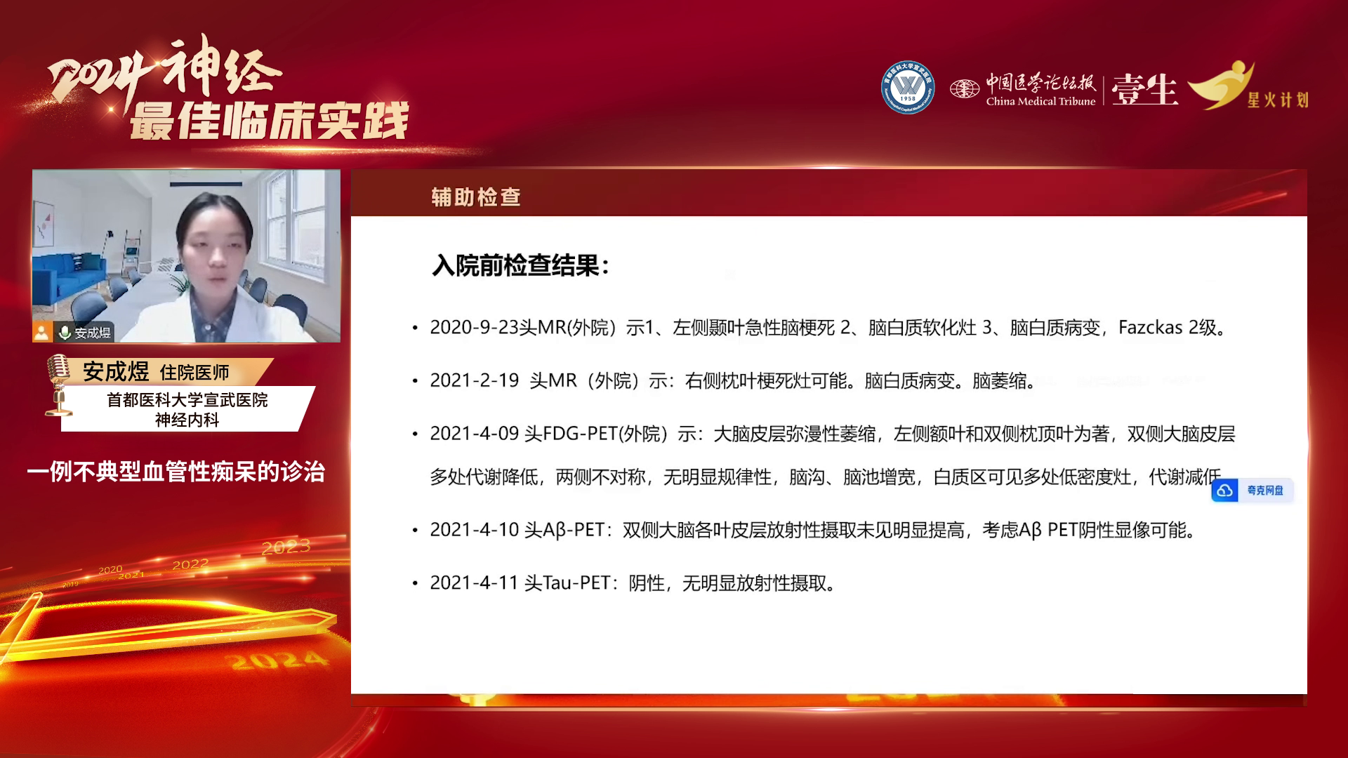 为明确诊断,进一步检查发现:24小时动态心电图示窦性心律异常、偶发房早室早伴ST-T段改变;右心声学造影阳性;经食道超声检查提示卵圆孔未闭;双下肢深静脉超声未见明显异常,这些均提示存在血管性危险因素。腰穿送检AD四项检查显示Aβ42升高(1064.42 pg/ml)、p-Tau 降低(29.65 pg/ml),不符合典型AD表现。