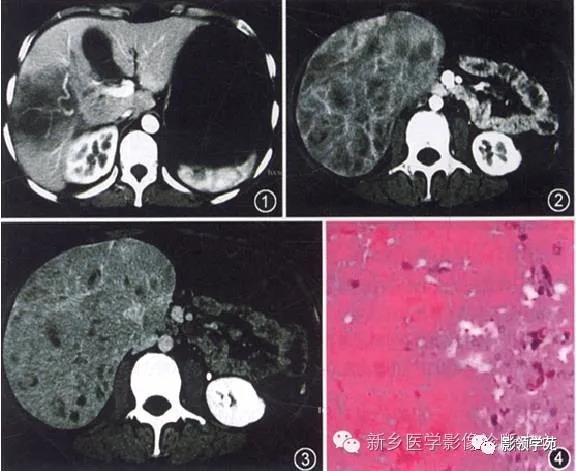 (3)增强扫描呈轻度到明显强化,密度可高于周围肝组织,亦可低于正常肝组织。延迟扫描病灶呈等密度或低密度。