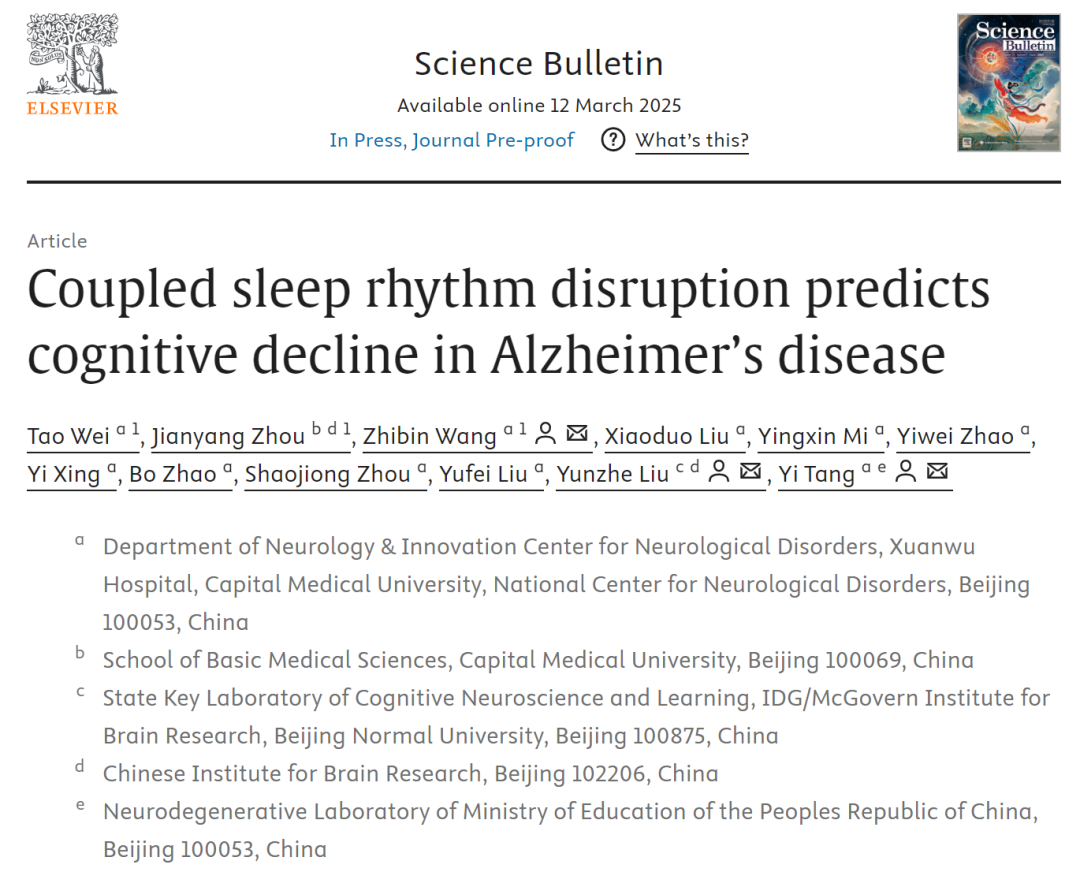 近日,国家神经疾病医学中心首都医科大学宣武医院唐毅教授团队,联合北京脑科学与类脑研究所、北京师范大学柳昀哲教授团队,在Science Bulletin发表研究论著“Coupled sleep rhythm disruption predicts cognitive decline in Alzheimer’s disease”。研究团队综合运用睡眠脑电、神经影像、脑脊液病理标记物及认知功能评估数据,系统阐述了睡眠节律在阿尔茨海默病进展过程中的动态演变模式,并进一步阐明了其在疾病进展中的关键作用。