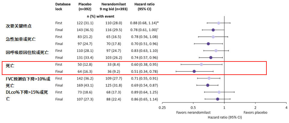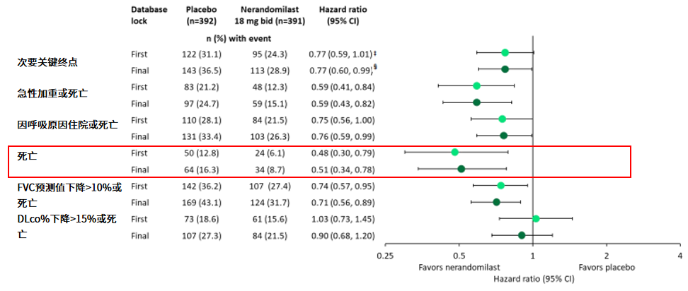 关键次要研究终点:与安慰剂相比,两种剂量的nerandomilast治疗组对PPF患者在首次ILD急性加重、因呼吸原因住院或死亡的时间上的风险均显著降低(9mg组 HR=0.78,0.6-1.00;18mg组 HR=0.77,0.60-0.99)6。