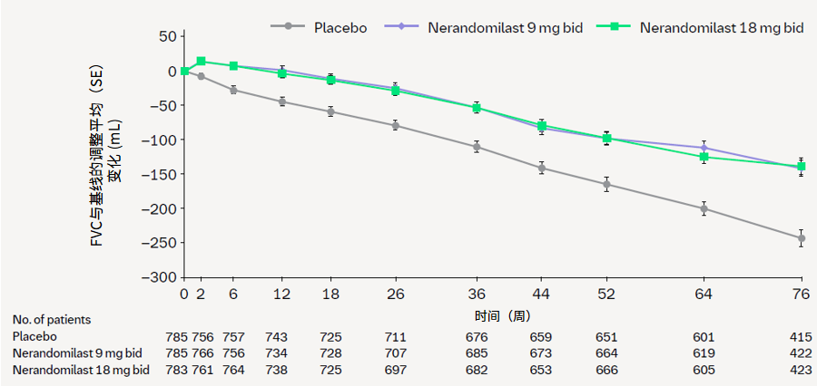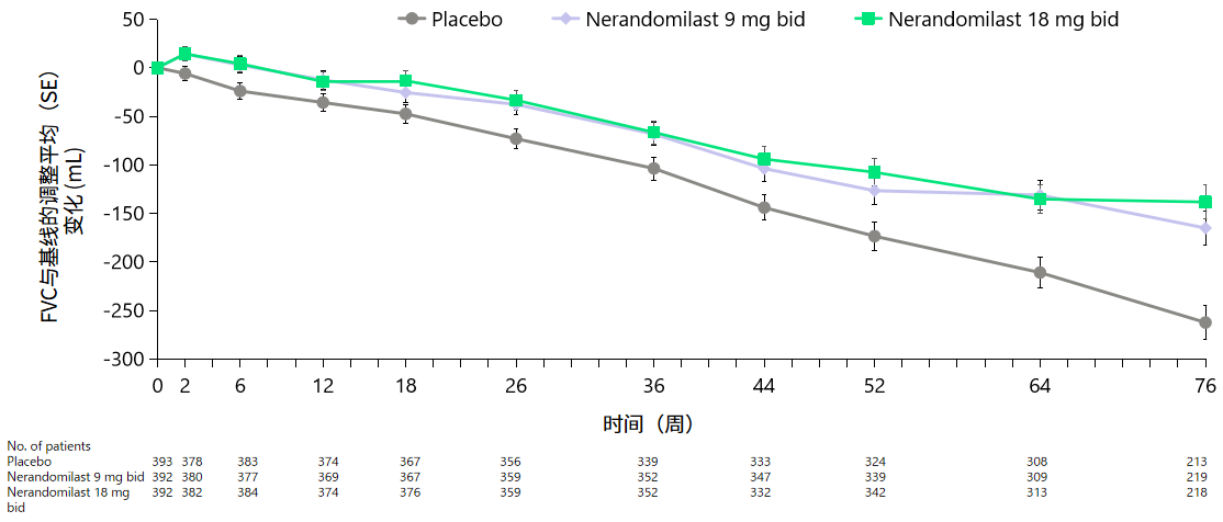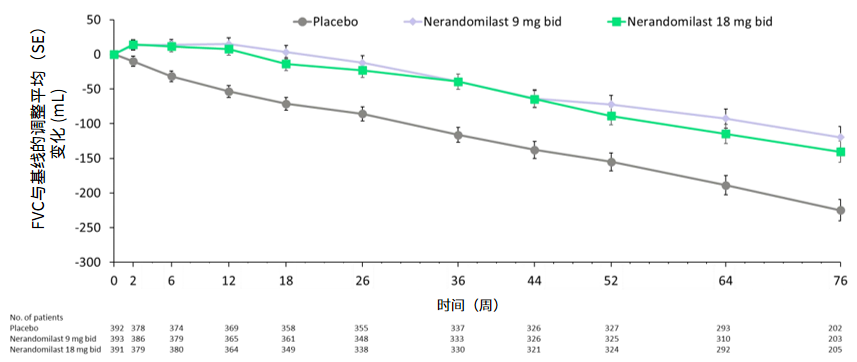 主要研究终点:nerandomilast两个剂量组(9mg组、18mg组)和安慰剂的FVC曲线早期分离,并在76周内持续分开(图3)6。