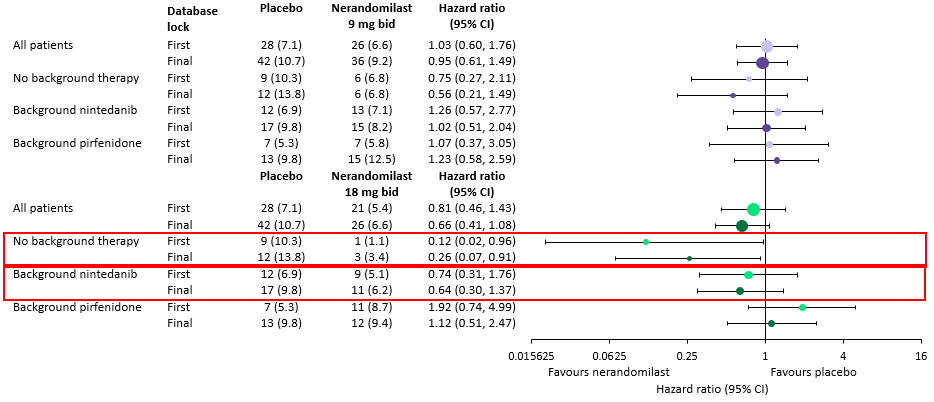 其中死亡率结果值得关注,数据显示:整体人群中,nerandomilast 18mg组风险降低(HR=0.66,0.41-1.08);无抗纤维化背景治疗亚组中,18mg组的死亡风险显著降低,52周(HR=0.12,0.02-0.96)和76周(HR=0.26,0.07-0.91)均呈现出显著获益4;在有尼达尼布治疗背景的亚组中,18mg组的死亡风险从0.74降低至0.64,呈现出改善趋势(图2)。