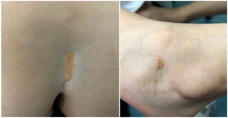 我在门诊遇到一个5岁的小女孩,出生后不久,发现臀部黄色瘤,一开始只有一个,后来越长越多,脚踝、膝关节和肘关节都有(图1和图2)。