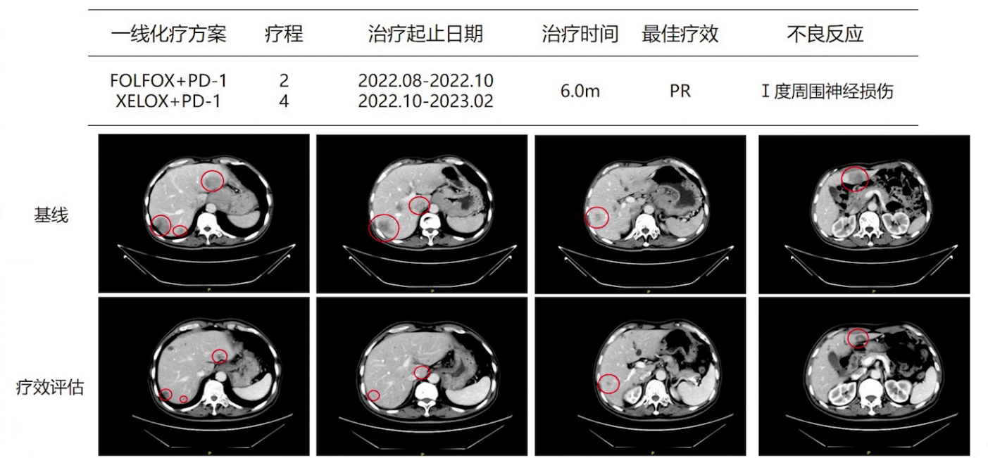 2022年8月-2023年2月,患者接受替吉奥+奥沙利铂+帕博利珠单抗治疗,期间因治疗方便,化疗方案从FOLFOX调整为XELOX。治疗期间患者耐受性良好,仅出现Ⅰ度周围神经损伤。影像学显示肝脏转移病灶缩小,吞咽困难及腹胀症状缓解,肿瘤标志物CA19-9从接近20000ng/mL降至293ng/mL。2023年4月,患者开始卡培他滨+帕博利珠单抗维持治疗。