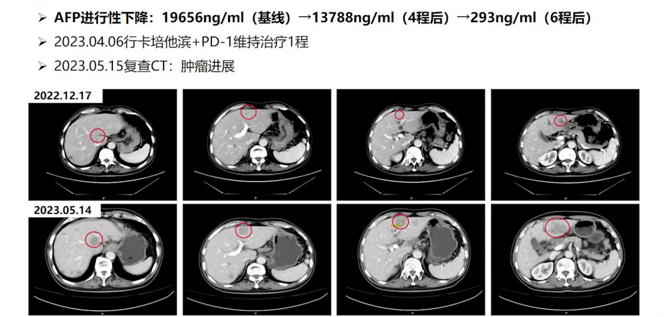 2023年5月,患者复查CT提示肝转移灶增大,评估为PD。经筛选,患者符合科室开展的CTLA-4单抗C392临床研究,于6月8日入组并接受治疗。3周左右,患者出现腹胀、纳差、乏力,当地医院检查示肝酶与胆红素轻度升高,返院检查发现肿瘤标志物明显升高,AFP>121000ng/mL,CA19-9与CEA也显著升高,CT显示肝内转移病灶增多增大,考虑出现免疫治疗超进展。