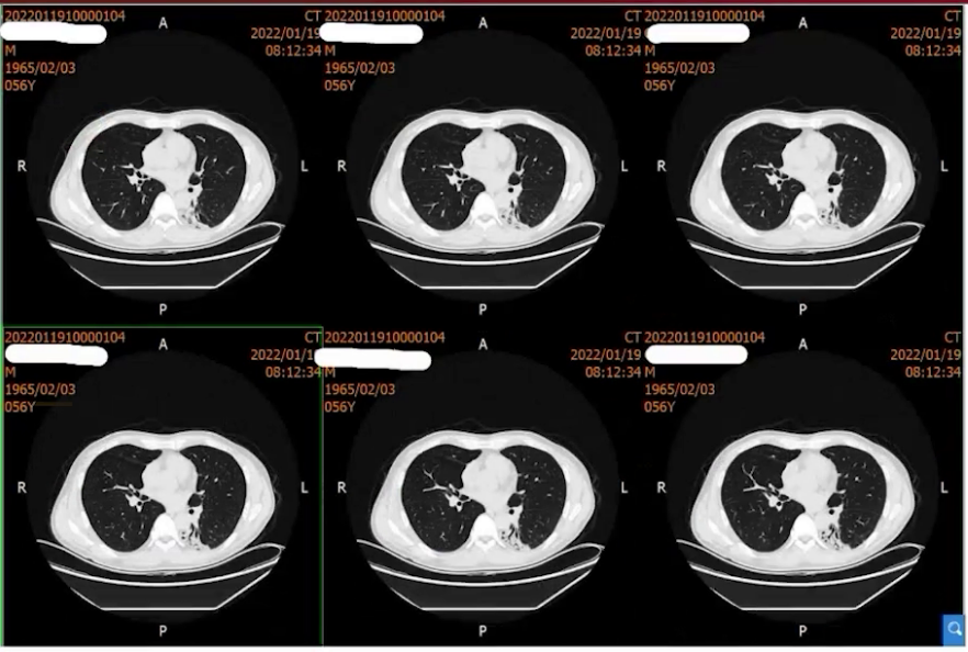 2021年10月起出现干咳伴发热(体温37.9℃),起初未重视,后咳嗽加剧伴咳白黏痰。11月15日于当地医院就诊,考虑肺炎,予青霉素联合阿奇霉素治疗一周,症状无改善。11月27日行胸部CT检查,提示左下肺斑片实变影,考虑继发性肺炎可能,给予泼尼松15mg BID一周、10mg BID一周治疗。治疗两周症状未缓解,且出现心悸气促,复查胸部CT病灶无吸收,遂自行停药,改服复方甘草合剂。两周后症状依旧,至第二家医院就诊,胸部CT显示肺部病灶增多变实,仍考虑继发性肺炎,予泼尼松30mg qd口服半月,气促稍有好转后又自行停药,期间辅以莫西沙星抗感染、乙酰半胱氨酸抗氧化治疗,复查胸部CT病灶仍无吸收,遂至我院。