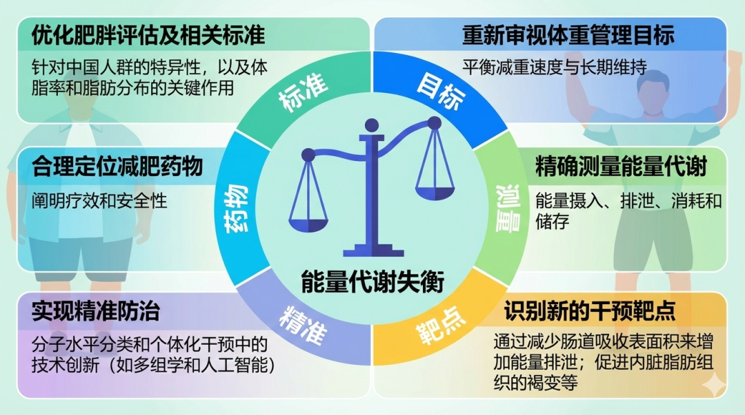 本述评聚焦体重管理中的若干核心科学问题,包括能量代谢稳态、减重后的长期维持以及肥胖的精准管理。内容涵盖优化肥胖评估方法、重新审视体重管理目标、识别新的干预靶点、推进体重管理精准化,以及合理定位减重药物的作用(见图1)。