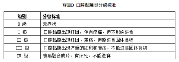 采用世界卫生组织(WHO)口腔黏膜炎分级标准,对口腔黏膜炎的严重程度进行评估。这就好比给炎症的“破坏力”打分,让医护人员能够清晰地了解病情的轻重,从而制定出更有针对性的治疗方案。