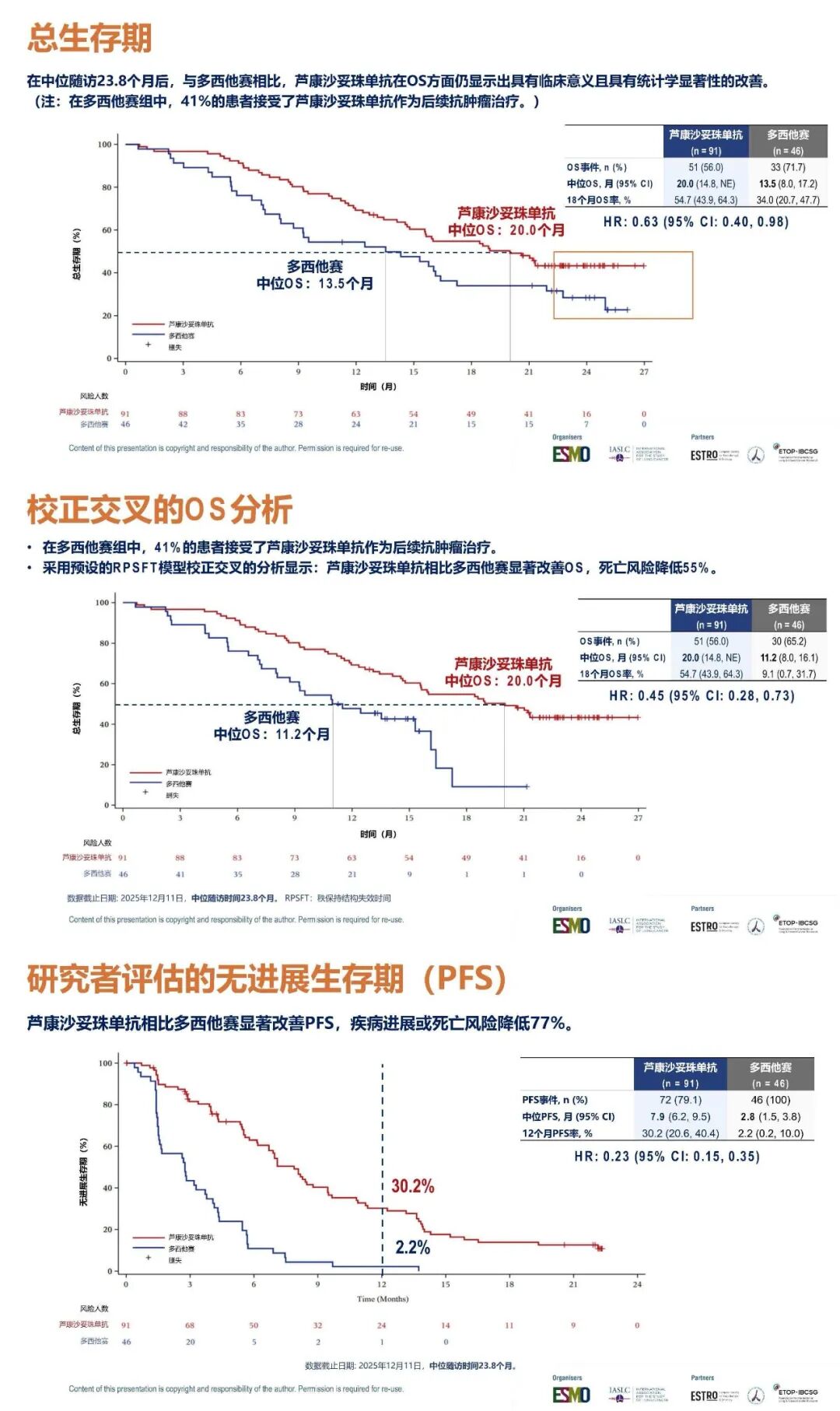 在此背景下,中国自主研发的TROP2抗体偶联药物(ADC)芦康沙妥珠单抗在OptiTROP-Lung03研究中交出了令人振奋的答卷5。该研究入组患者超过90%为三代EGFR-TKI耐药人群,结果显示:芦康沙妥珠单抗组中位无进展生存期(PFS)达7.9个月,对照组(多西他赛组)为2.8个月(HR=0.23);中位OS达20.0个月,对照组为13.5个月(HR=0.63),这样优异的数据是在对照组41%的患者交叉至芦康沙妥珠单抗的前提下达成的,坚实地印证了芦康沙妥珠单抗应该先于多西他赛使用,最大化患者生存获益。经RPSFT模型校正交叉治疗的影响后,HR进一步降至0.45;18个月OS率试验组为54.7%,达到了对照组9.1%的6倍。