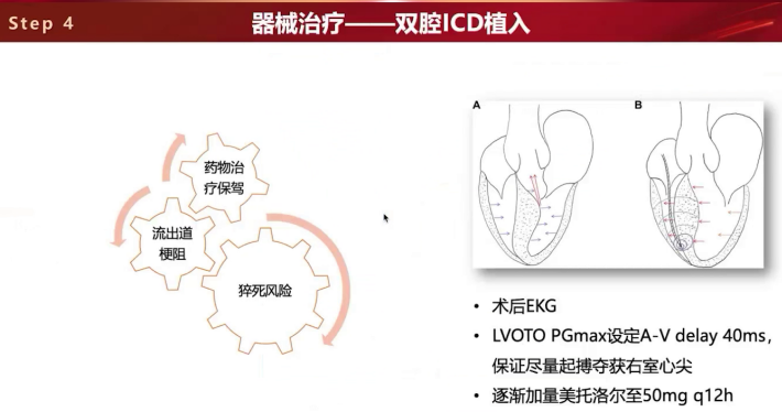 为患者植入双腔ICD。通过将电极置于右室心尖部,并设置较短的房室(AV)间期,实现右室心尖部优先起搏。该起搏模式可使室间隔预先激动并向右偏移,延迟左室侧壁收缩,从而减轻左室流出道梗阻。