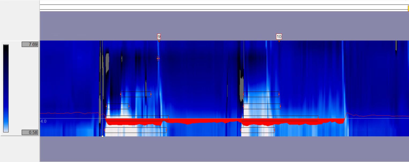 (4)反流的高度:发生反流事件时,若反流只达到远端通道(Z4~Z6),则认为是远端反流(如图4),若反流达到了LES上方15cm以上的近端通道(Z1和Z2),则可认为是近端反流(如图5)。