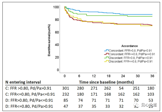 图5:FFR和静息Pd/Pa结果差异分组的无事件生存曲线