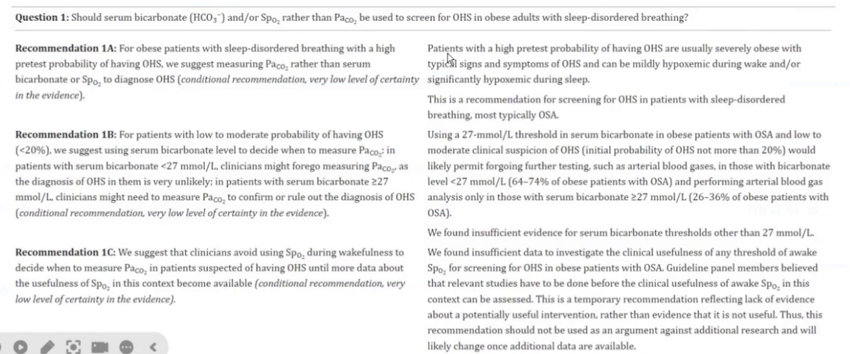 (1)当OHS疑似度不高时(<20%),临床医生可使用血清碳酸氢盐水平<27mmol/L排除有睡眠障碍的肥胖患者的OHS诊断,但对OHS疑似度高的患者则应测量动脉血气。