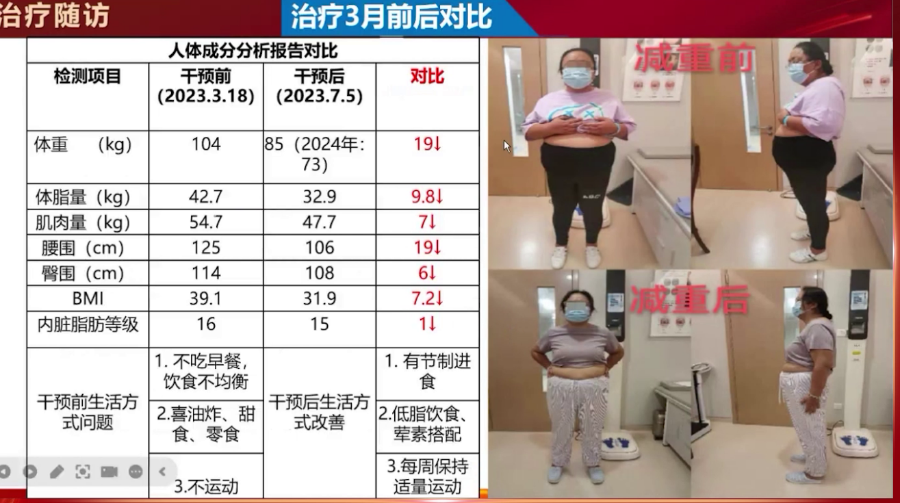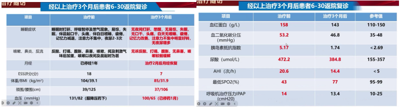 经过3个月治疗,患者体重从102kg减至83.6kg,睡眠相关症状、咳嗽鼻炎、胃食管反流均得到缓解,停经1年后恢复月经,嗜睡评分从重度嗜睡恢复正常,BMI、颈围、腰围降低,血压改善,血红蛋白、二氧化碳、胰岛素抵抗、尿酸恢复正常,睡眠呼吸暂停从中度变为轻度,氧合改善,呼吸机治疗压力下调,虽仍有脂肪肝,但全天血压未升高,肺功能激发试验仍阳性(存在咳嗽变异性哮喘),人体成分分析显示体脂量、腰围、臀围、BMI、内脏脂肪均下降。