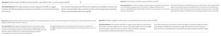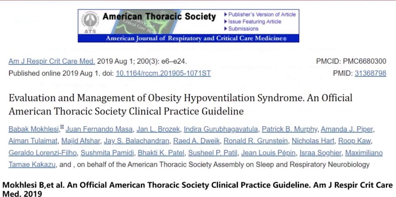 (2)稳定并活动自如的OHS患者应接受气道正压通气(PAP);持续气道正压(CPAP)应作为稳定并活动自如的OHS伴有严重阻塞性睡眠呼吸暂停患者的一线治疗;建议怀疑有OHS的呼吸衰竭住院患者出院前开始使用无创通气治疗,出院后3月内门诊复诊并接受气道正压通气治疗;OHS患者在接受减重干预后,体重减轻25%至30%才能缓解OHS(更容易通过减肥手术获得)。