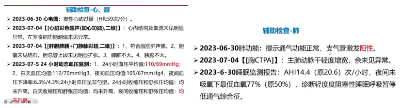 患者20年前打鼾渐重,无夜间憋醒及白天不适,未重视。2年前出现夜间呼吸暂停、憋气,伴失眠、口干、头痛、白天嗜睡疲倦,还有反酸、嗳气、腹胀、鼻塞、咳嗽等,咳嗽夜间及晨起明显,夜尿2-3次,日常无呼吸困难。2021年11月于云南某三甲医院住院,诊断为代谢综合征、肥胖高血压1级。当时BMI 41.8,血气二氧化碳42.3mmHg ,睡眠监测提示AHI 20(中度睡眠呼吸暂停伴重度夜间低氧血症),全天血压高。心脏超声示左房扩大、肺动脉高压,肺通气轻度受限舒张阴性;胸部CT示肺动脉高压、右心增大、双肺磨玻璃影;冠脉CTA示冠脉粥样硬化及肺动脉高压。给予单水平辅助通气(CPAP 16cmH₂O),患者配合良好,睡眠改善;同时使用利拉鲁肽减重12天,体重下降10kg,但因反复低血糖停用,后靠饮食控制,体重稳定在97kg。2022年12月感染新冠后,无法配合呼吸机,症状加重,遂来我院门诊,考虑OSAHS、代谢综合征、肥胖低通气综合征,收入我科。