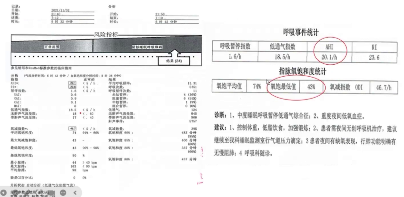 睡眠呼吸检测:提示AHI 20,最低血氧43%(中度睡眠呼吸暂停)。