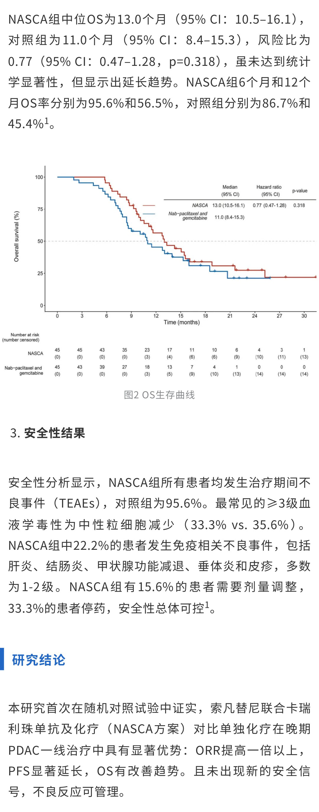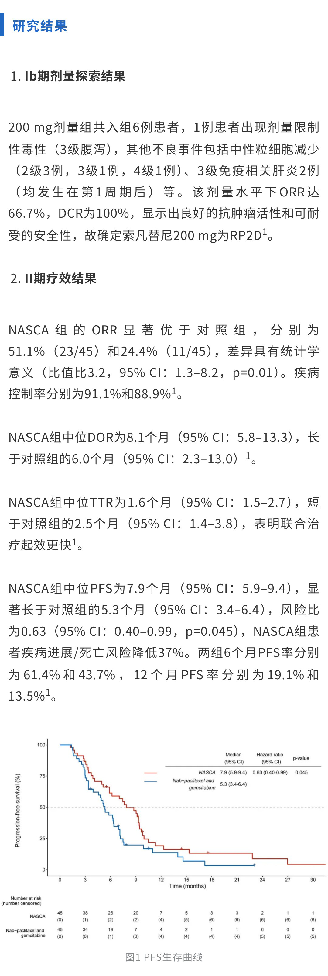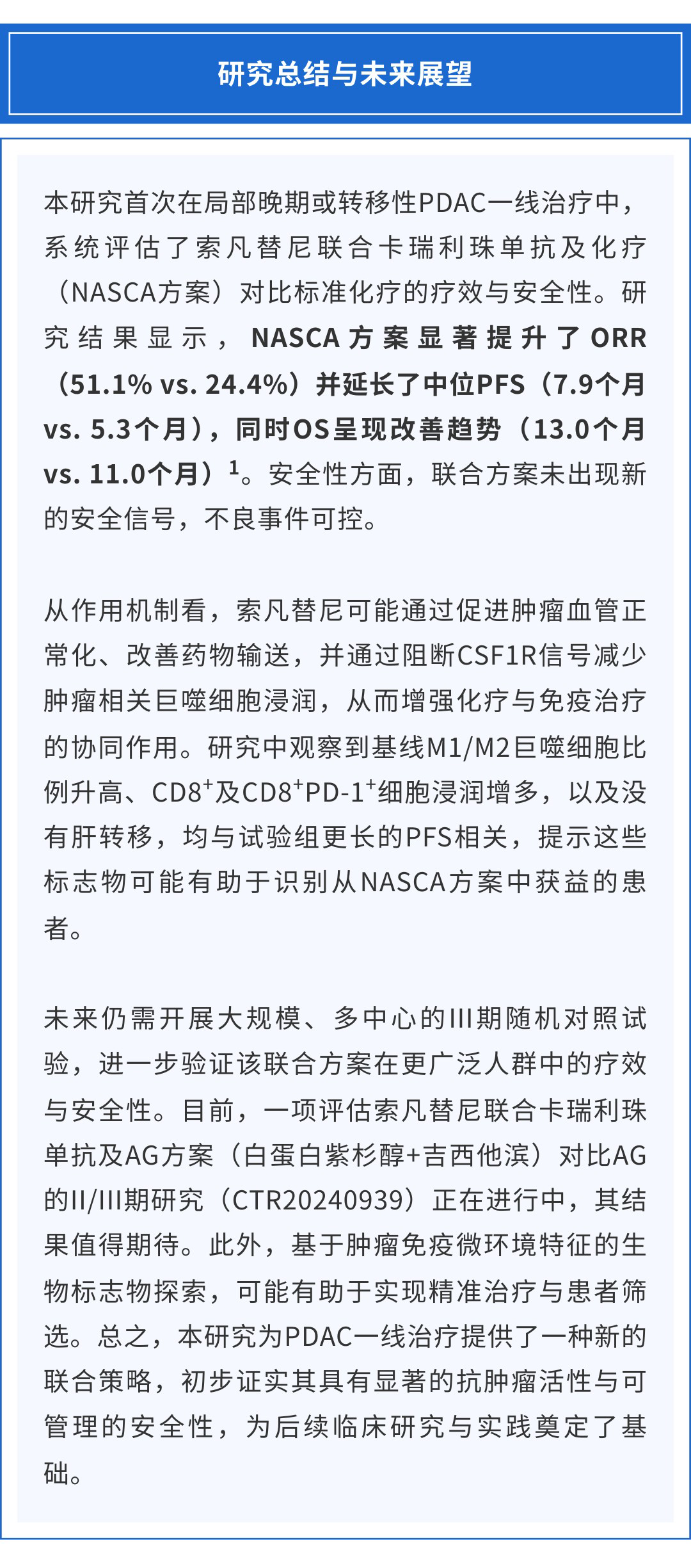 胰腺导管腺癌(PDAC)是恶性程度高、预后差的消化道肿瘤,临床治疗手段有限。近期,中国人民解放军总医院戴广海教授团队在国际权威期刊Signal Transduction and Targeted Therapy(IF 52.7)发表了一项Ib/II期研究。该研究结果显示,索凡替尼联合卡瑞利珠单抗(抗PD-1单抗)及化疗一线治疗晚期PDAC可显著提升客观缓解率与无进展生存期¹,为该联合方案的一线应用提供了重要循证支持。