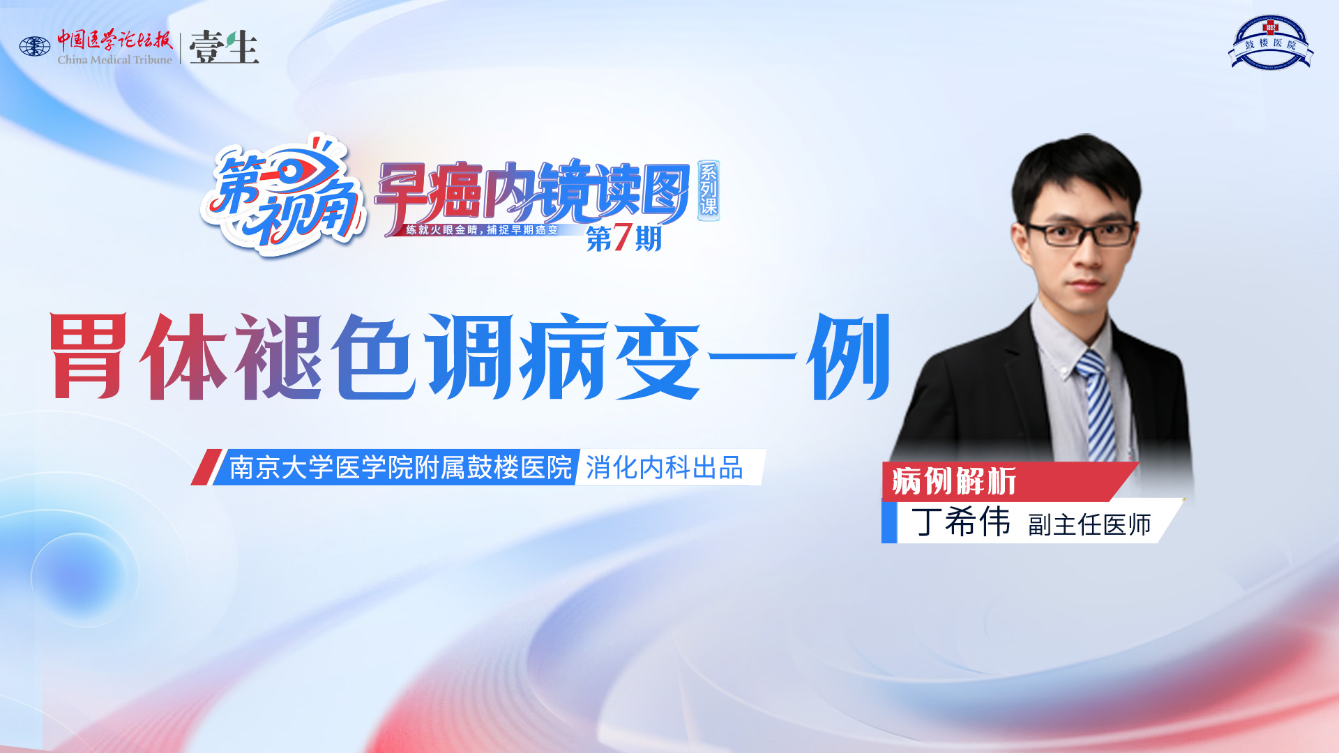 点我填写《第一视角——早癌内镜读图》后续课程需求调研系列课背景南京大学医学院附属鼓楼医院消化内科王雷主任医师指导、早癌亚专科策划的轻量系列课《第一视角 | 早癌内镜读图》,带你以术者第一视角,沉浸式解析早癌内镜图像,高效提升诊断思维和能力。首期于9月18日,在壹生APP·消化频道播出,欢迎关注,揭开真相。第7期胃体褪色调病变一例上线时间1月22日(周四)病例解析丁希伟 副主任医师南京大学医学院附属鼓楼医院消化内科本系列课程由南京鼓楼医院消化内科内镜团队精心制作,团队年均完成内镜检查10万余例,早癌检出率位居全国前列,拥有丰富的临床经验和教学经验。