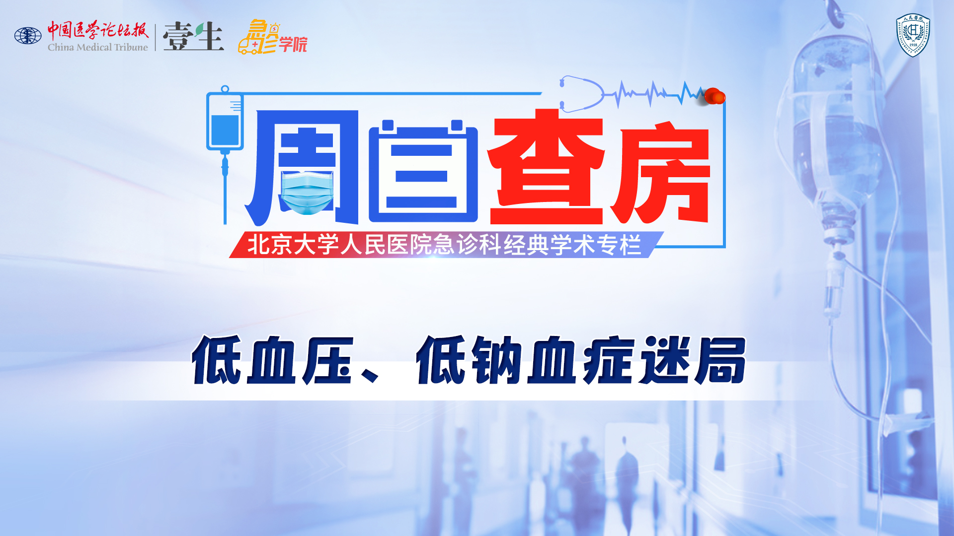 栏目介绍北京大学人民医院急诊科经典学术活动《周三查房》,自2020年11月起入驻中国医学论坛报·壹生急诊学院,经典病例结合急诊科核心知识点讲解,全部免费开放,供临床同道交流学习。更多内容,请安装壹生App,关注“急诊”频道。课程信息讲题:低血压、低钠血症迷局讲者:张锋 医生讨论专家:吕苏、迟骋等上线时间:3月27日(周五)温馨提示:微信搜索“壹生急诊学院”,关注后免费获得上课提醒,精彩内容不错过。