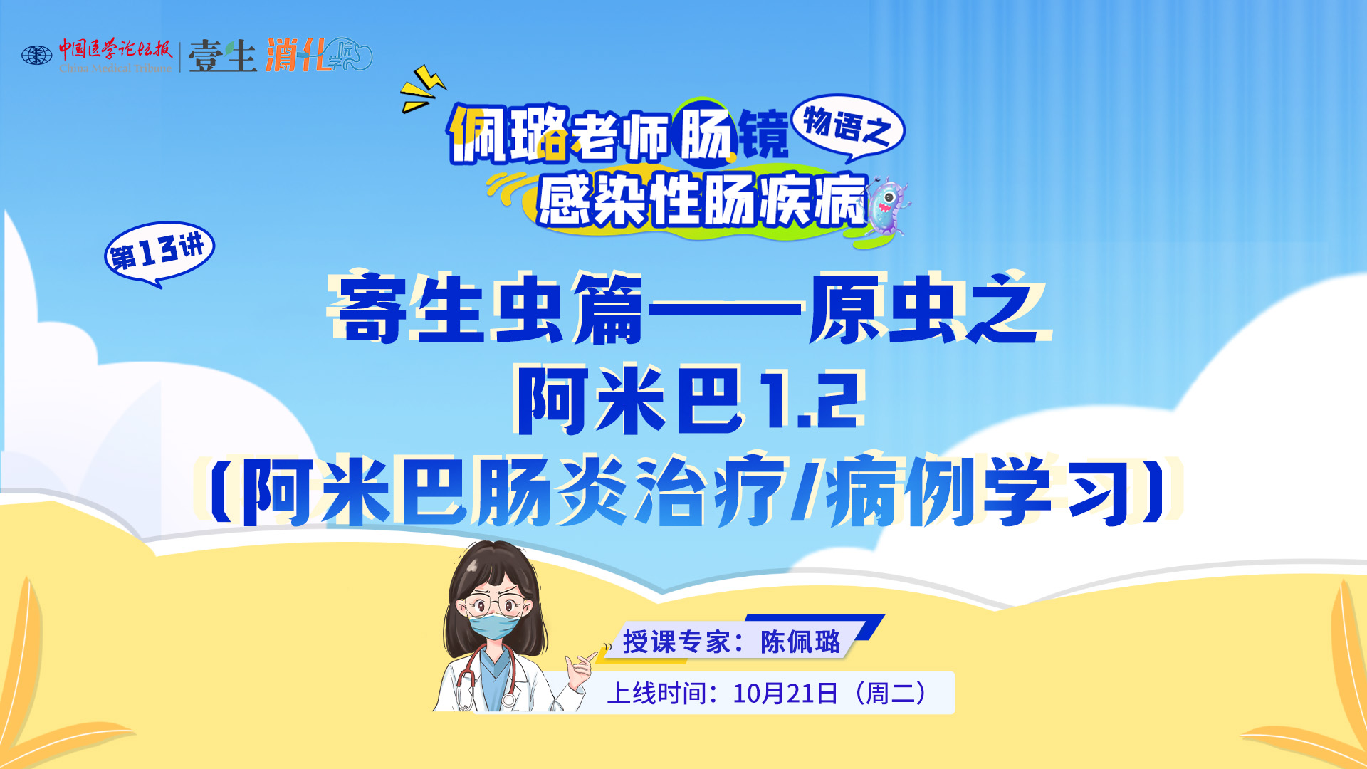 系列课介绍在跟随陈佩璐老师系统地学过内镜诊断之胃篇、食管篇,以及肠镜插入法后,我们已开启肠道疾病篇“佩璐老师肠镜物语”,肠道疾病相对繁杂,很多全身性疾病在肠道也有表现,本篇将以“物语”的形式开启新的疾病介绍,欢迎跟随佩璐老师在内镜诊断的路上继续学习,打开思路,同时温故知新。本期讲题寄生虫篇——原虫之阿米巴1.2(阿米巴肠炎治疗/病例学习)授课专家陈佩璐上线时间10月21日(周二)内容简介1、阿米巴肠炎诊断、治疗2、阿米巴肠炎病例解读3、虫虫欢乐歌温馨提示:微信搜索“壹生消化学院”,关注后免费获得上课提醒,精彩内容不错过。欢迎添加消化助手微信“17600861273”,进入论坛报消化内镜群交流。书籍推荐陈佩璐老师最新译著推介:《内镜医生和技师的大肠肿瘤诊疗实战病例集》、《十二指肠内镜图谱》【本书特色】《内镜医生和技师的大肠肿瘤诊疗实战病例集》《十二指肠内镜图谱》【现货购买方式】1. 京东搜索店铺“江苏凤凰科学技术出版社图书官方旗舰店”《内镜医生和技师的大肠肿瘤诊疗实战病例集》搜索“大肠肿瘤”《十二指肠内镜图谱》搜索“十二指肠”~~佩璐老师两本书同时购买有优惠哦!2. 添加出版社易编辑微信号15295522866