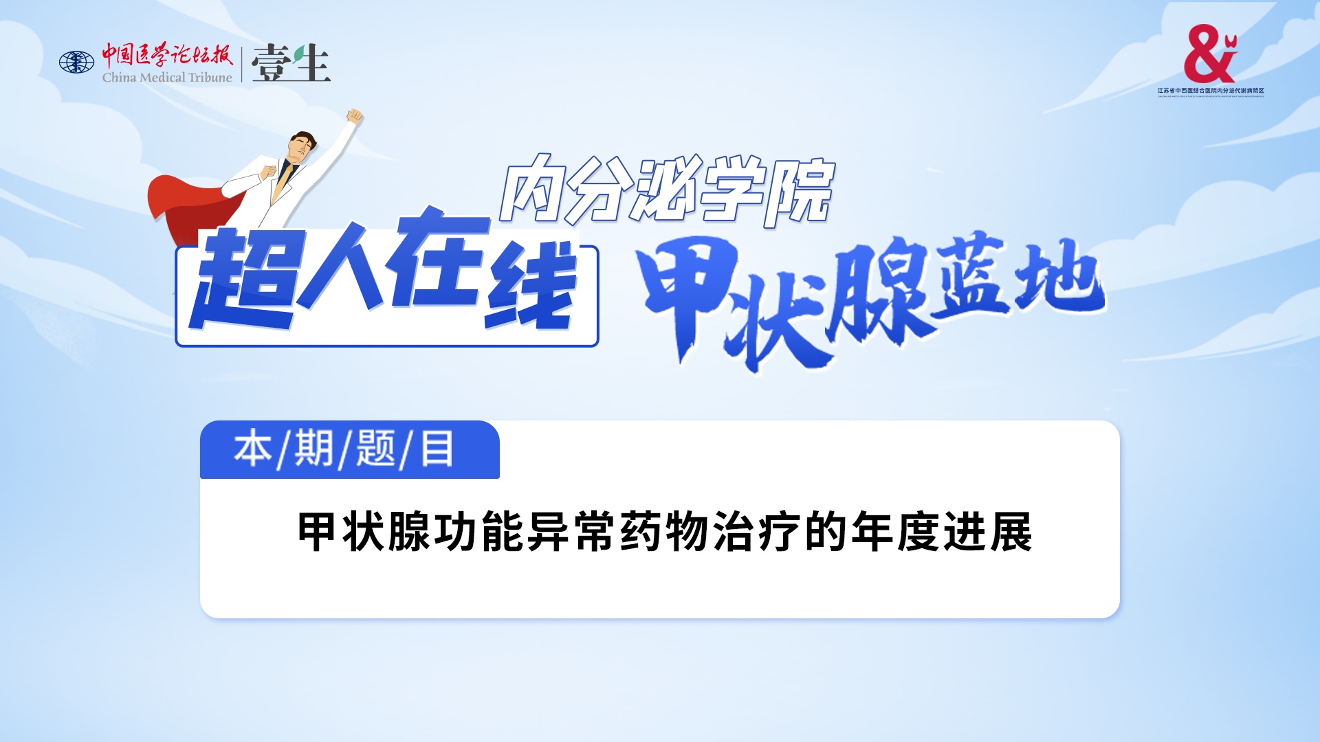 『超人在线·甲状腺蓝地』由南京中医药大学附属中西医结合医院内分泌代谢病院区刘超教授和徐书杭教授共同策划,通过系列讲座、病例讨论、新知快递、焦点访谈等方式,从基础知识到临床实践,全面介绍甲状腺的解剖、生理和病理,重点关注各类甲状腺疾病诊治的重点、难点和热点问题,并针对最新指南给予解读和评述,以期为广大医疗从业人员搭建经典、权威、全方位和多视角的甲状腺和甲状腺疾病学习、讨论和交流的平台。本期讲题甲状腺功能异常药物治疗的年度进展主讲嘉宾徐书杭 教授南京中医药大学附属中西医结合医院