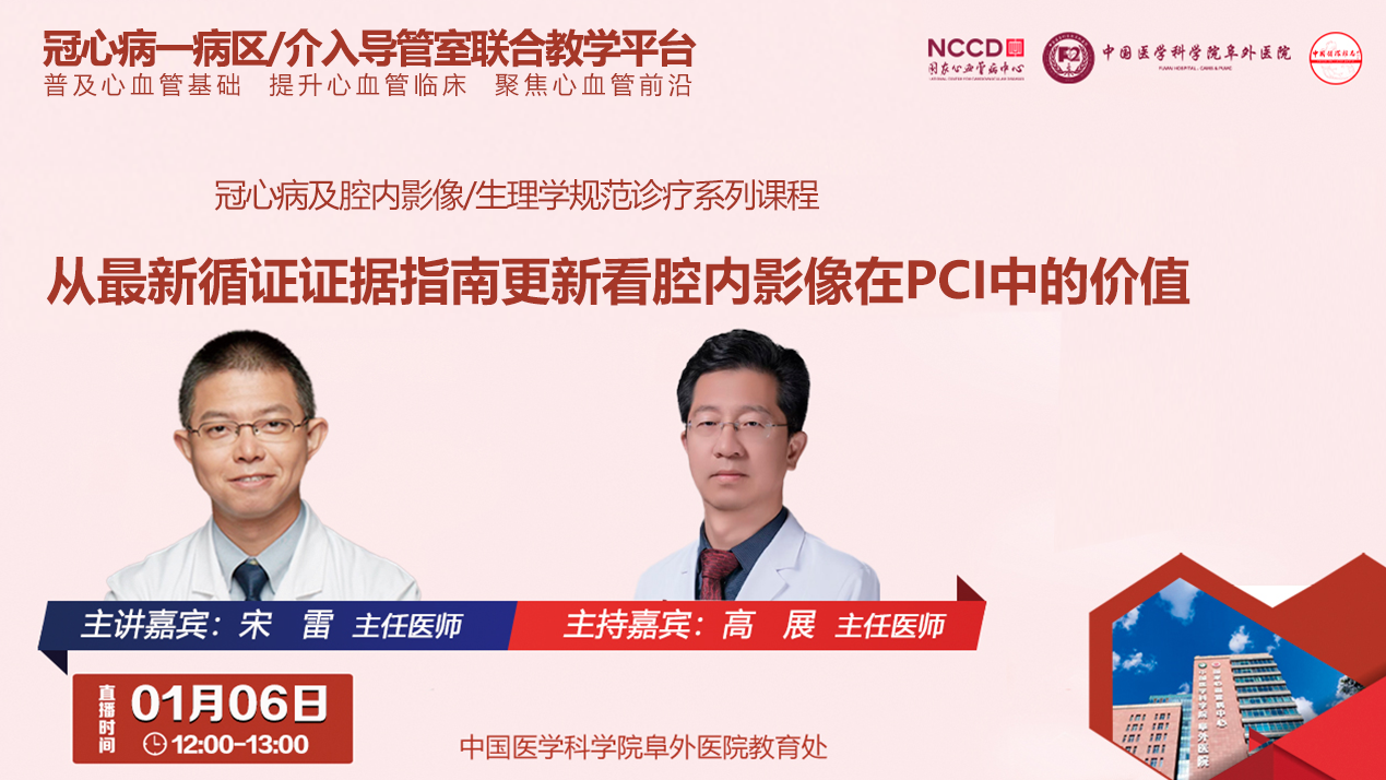 直播主题:从最新循证证据指南更新看腔内影像在PCI中的价值腔内影像指导冠脉介入治疗,已得到国内外指南的一致推荐。本次课程将结合国内外最新研究证据,指南更新,深入探讨其对冠脉介入治疗的临床价值,旨在提高临床医生对腔内影像技术的认识,并提升其临床实践能力!直播时间:2026年1月6日(周二)12:00-13:00主讲专家:宋雷 主任医师 中国医学科学院阜外医院主持专家:高展 主任医师 中国医学科学院阜外医院