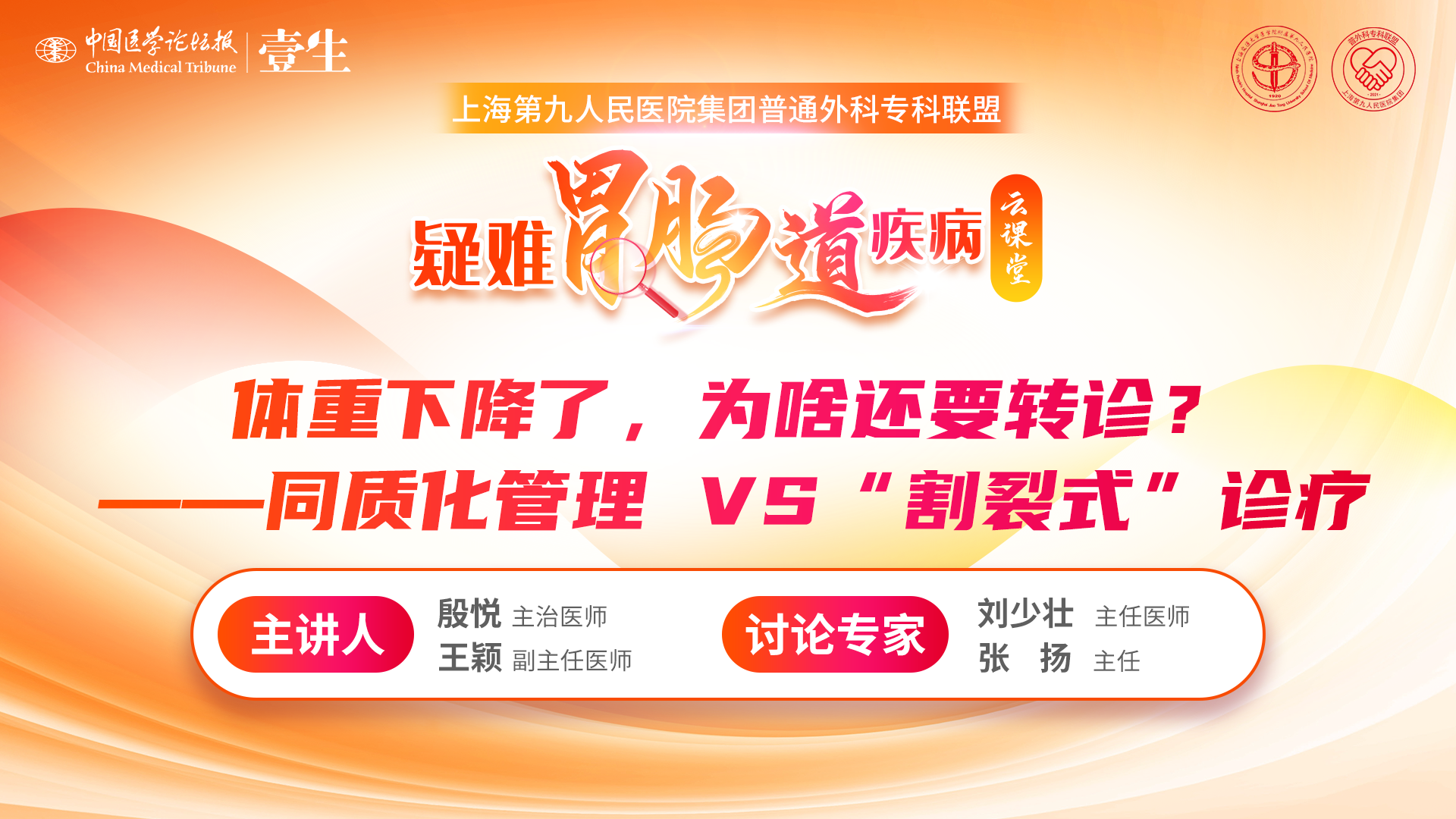 『上海九院疑难胃肠道疾病云课堂』是由上海交通大学医学院附属第九人民医院普外科牵头策划、上海第九人民医院集团普通外科专科联盟联合出品的系列专栏,聚焦疑难胃肠道疾病的诊治,每期以“专题讲座+专家讨论/答疑”形式,分享有代表性的疑难病例,解读国内外相关疾病指南,系统梳理疾病诊治思路,通过学术活动与全国同道们交流学习,共同成长!【本期主题】体重下降了,为啥还要转诊?——同质化管理VS“割裂式”诊疗【主席】李幼生 主任医师,王兵 主任医师 【本期主讲】殷悦 主治医师(上海交通大学医学院附属第九人民医院),王颖 副主任医师(上海市黄浦区豫园街道社区卫生服务中心)【讨论专家】刘少壮 主任医师(山东大学齐鲁医院),张扬 主任(上海市黄浦区豫园街道社区卫生服务中心)