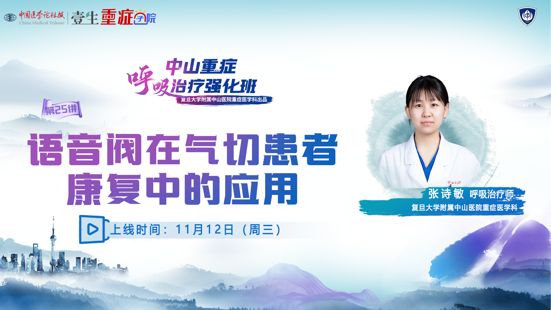 栏目介绍《中山重症呼吸治疗强化班》由中国医学论坛报社·壹生重症学院与复旦大学附属中山医院重症医学科共同出品,钟鸣主任牵头、刘凯主管呼吸治疗师精心策划、复旦中山ICU呼吸治疗团队授课,共25讲,涵盖呼吸支持精细化管理、高级呼吸监测优化治疗、撤机管理和无创呼吸支持、支气管镜技术和气道管理技术四大模块,从技术支持到评估优化,从规范操作到并发症处理,临床实用,欢迎关注!5月7日起,在壹生APP“重症”学科播出,每周三更新。第25节语音阀在气切患者康复中的应用上线时间11月12日(周三)授课专家张诗敏 呼吸治疗师复旦大学附属中山医院重症医学科课程安排