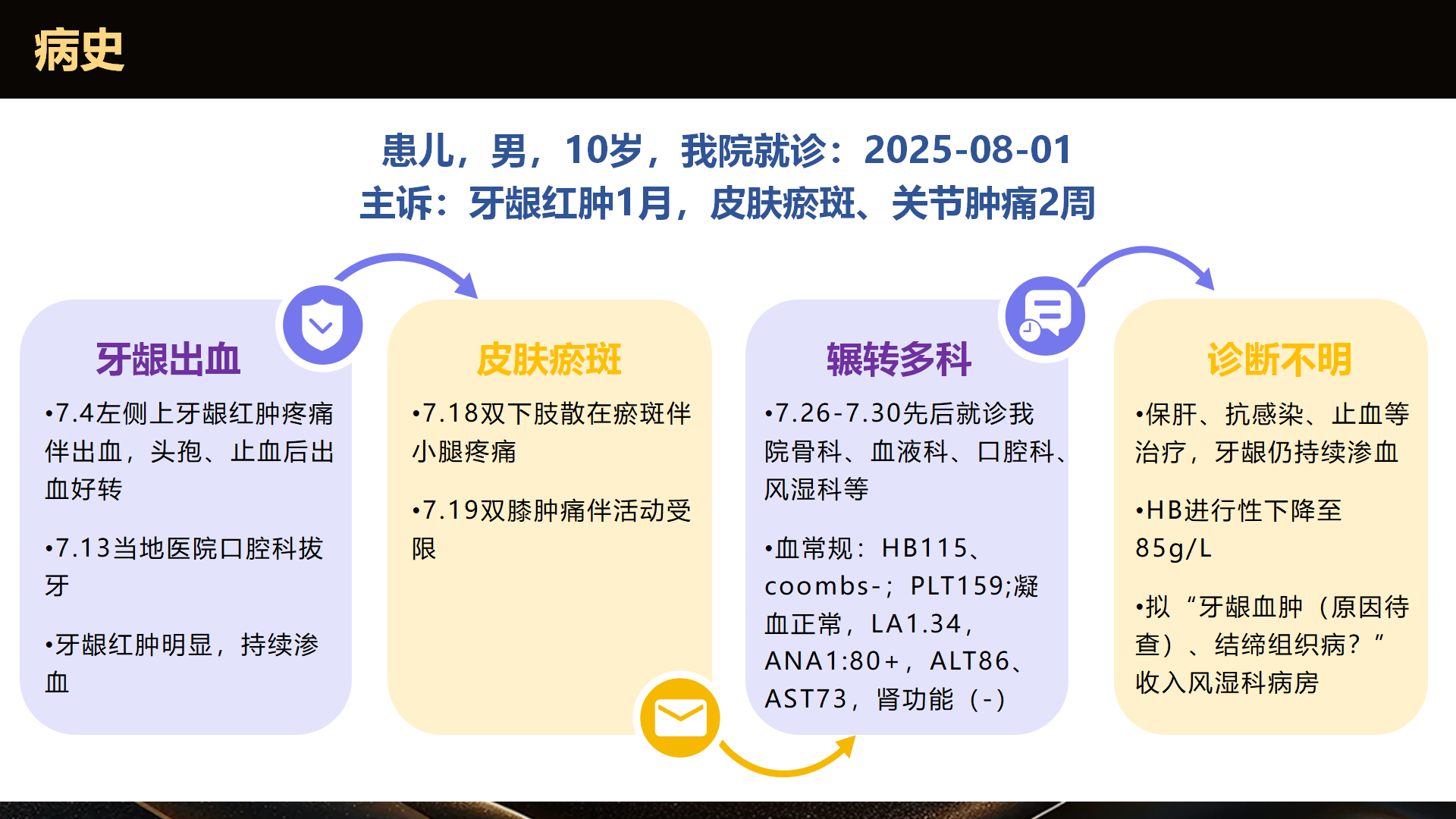 2025儿科最佳临床实践复旦大学附属儿科医院风湿科团队分享主讲嘉宾:曾巧钱 主治医师点评嘉宾:孙利 主任医师复旦大学附属儿科医院风湿科创建于2005年,并于2016年独立建科,擅长诊治各类常见、疑难、罕见及危重儿童风湿性疾病。在儿童系统性红斑狼疮(SLE)、儿童皮肌炎(JDM)、幼年型特发性关节炎(JIA)、系统性血管炎和单基因自身免疫/自身炎症性疾病等方面独具特色,在国内整体处于领先水平。是上海市级医院风湿病科联盟参与单位。开设了儿童SLE亚专科、幼年皮肌炎亚专科、幼年特发性关节炎亚专科、儿童硬皮病亚专科、儿童葡萄膜炎MDT、多发性大动脉炎MDT等多种疾病亚专科门诊,为患者提供更为精准、专业的医疗服务,提高治疗效果和患者满意度。