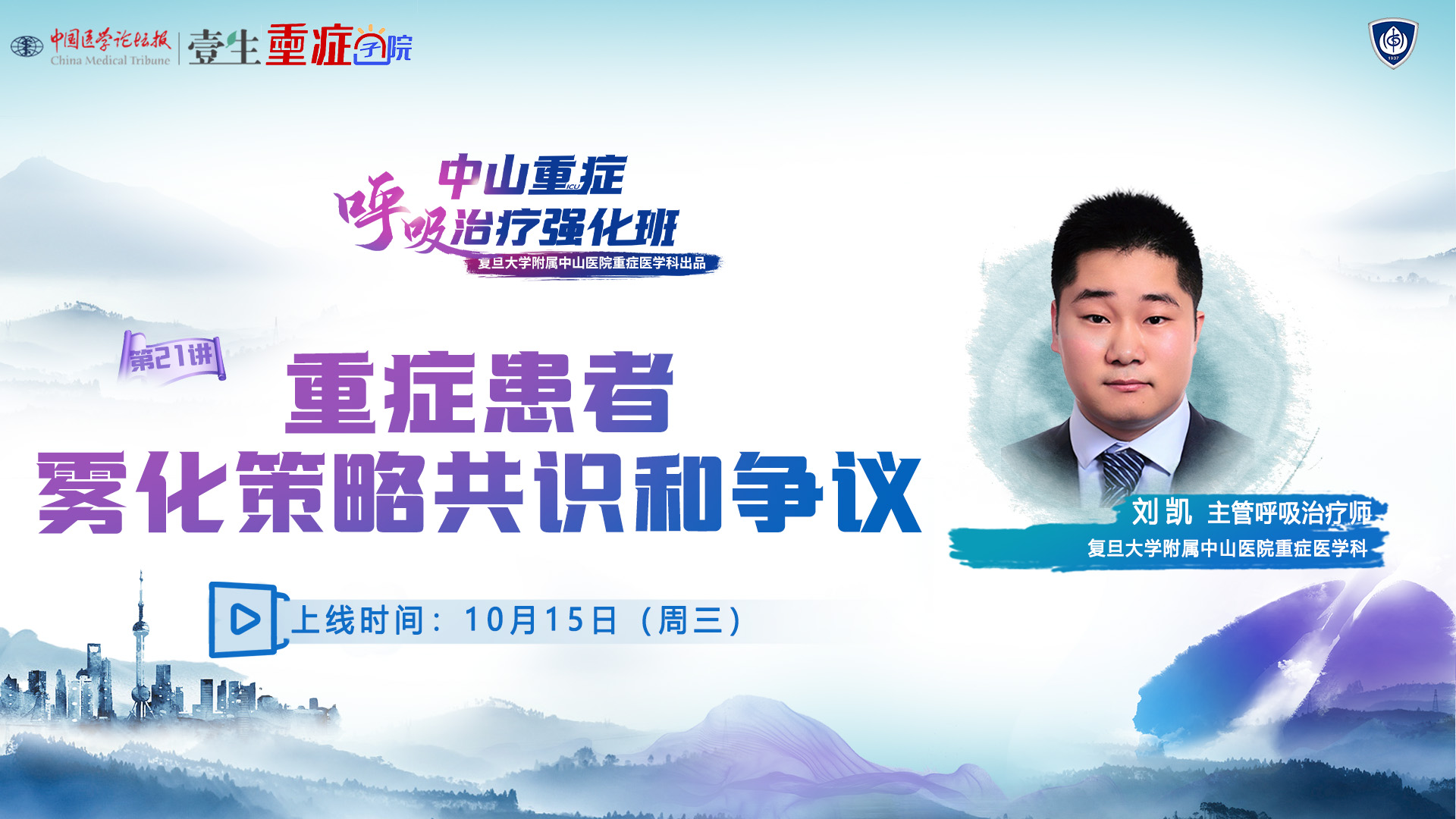 栏目介绍《中山重症呼吸治疗强化班》由中国医学论坛报社·壹生重症学院与复旦大学附属中山医院重症医学科共同出品,钟鸣主任牵头、刘凯主管呼吸治疗师精心策划、复旦中山ICU呼吸治疗团队授课,共25讲,涵盖呼吸支持精细化管理、高级呼吸监测优化治疗、撤机管理和无创呼吸支持、支气管镜技术和气道管理技术四大模块,从技术支持到评估优化,从规范操作到并发症处理,临床实用,欢迎关注!5月7日起,在壹生APP“重症”学科播出,每周三更新。第21节重症患者雾化策略共识和争议上线时间10月15日(周三)授课专家刘凯 主管呼吸治疗师复旦大学附属中山医院重症医学科课程安排