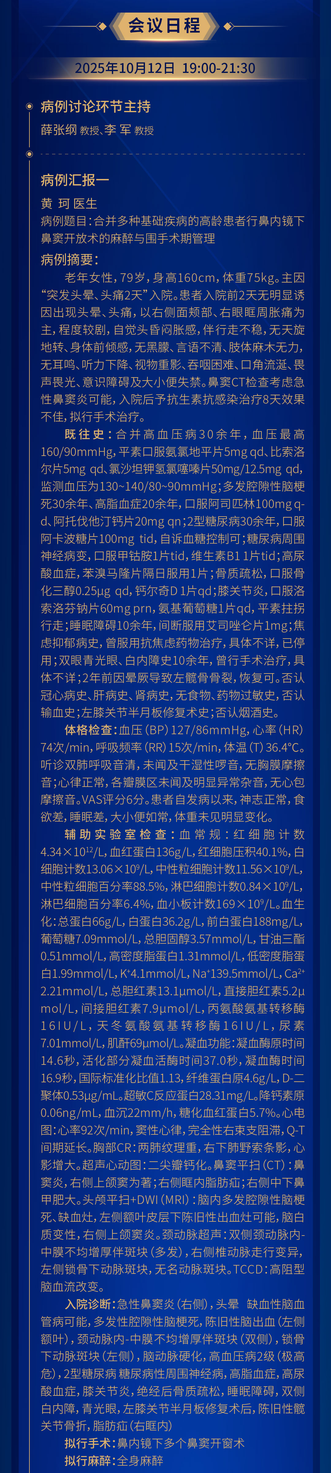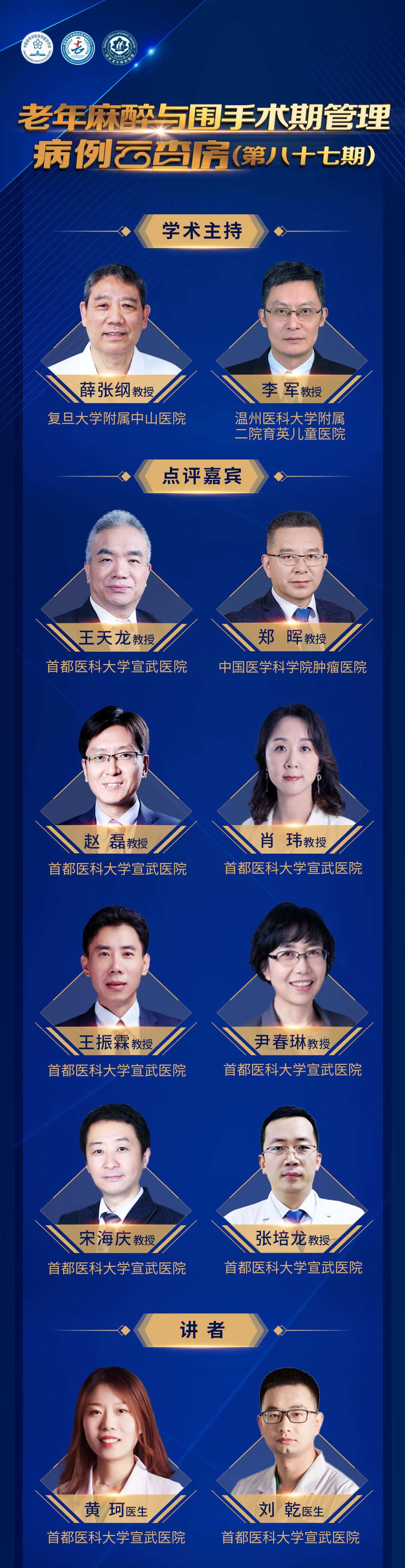 【老年患者麻醉与围术期管理病例云查房】由中国老年学和老年医学学会、中国老年学和老年医学学会脑疾病分会、国家老年疾病临床医学研究中心(宣武医院)和国家老年麻醉联盟(NAGA)共同主办。