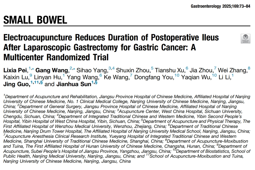 电针或可缩短胃癌腹腔镜切除术后肠麻痹(POI)持续时间,但现有证据有限。本研究旨在评估电针在缩短胃癌腹腔镜术后患者POI持续时间及促进胃肠功能恢复方面的疗效。