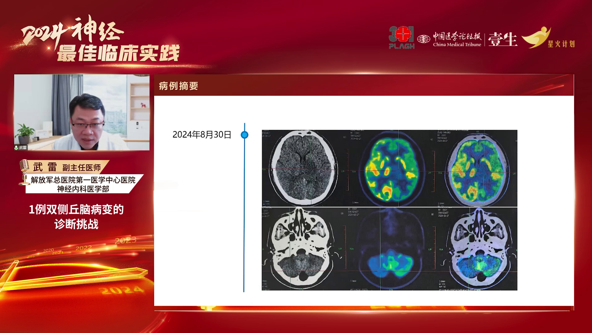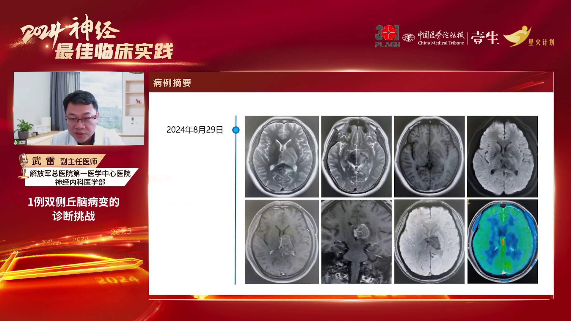 1) 基本情况:患者,38岁青年男性,因“头痛、记忆力下降、睡眠增多6天”就诊,发病前有受凉发热史,急性起病且症状逐渐加重。8月18日受凉后出现低热(37.6℃)、头痛、大汗及记忆力下降,次日体温恢复正常但仍有间断头痛,家属发现其言语较前减少、反应迟钝、情绪淡漠、记忆力减退较前加重,第三天出现嗜睡,第五天于当地医院行颅脑CT检查,发现左侧底节区丘脑等区域低密度灶,8月23日转诊至解放军总医院第一医学中心。